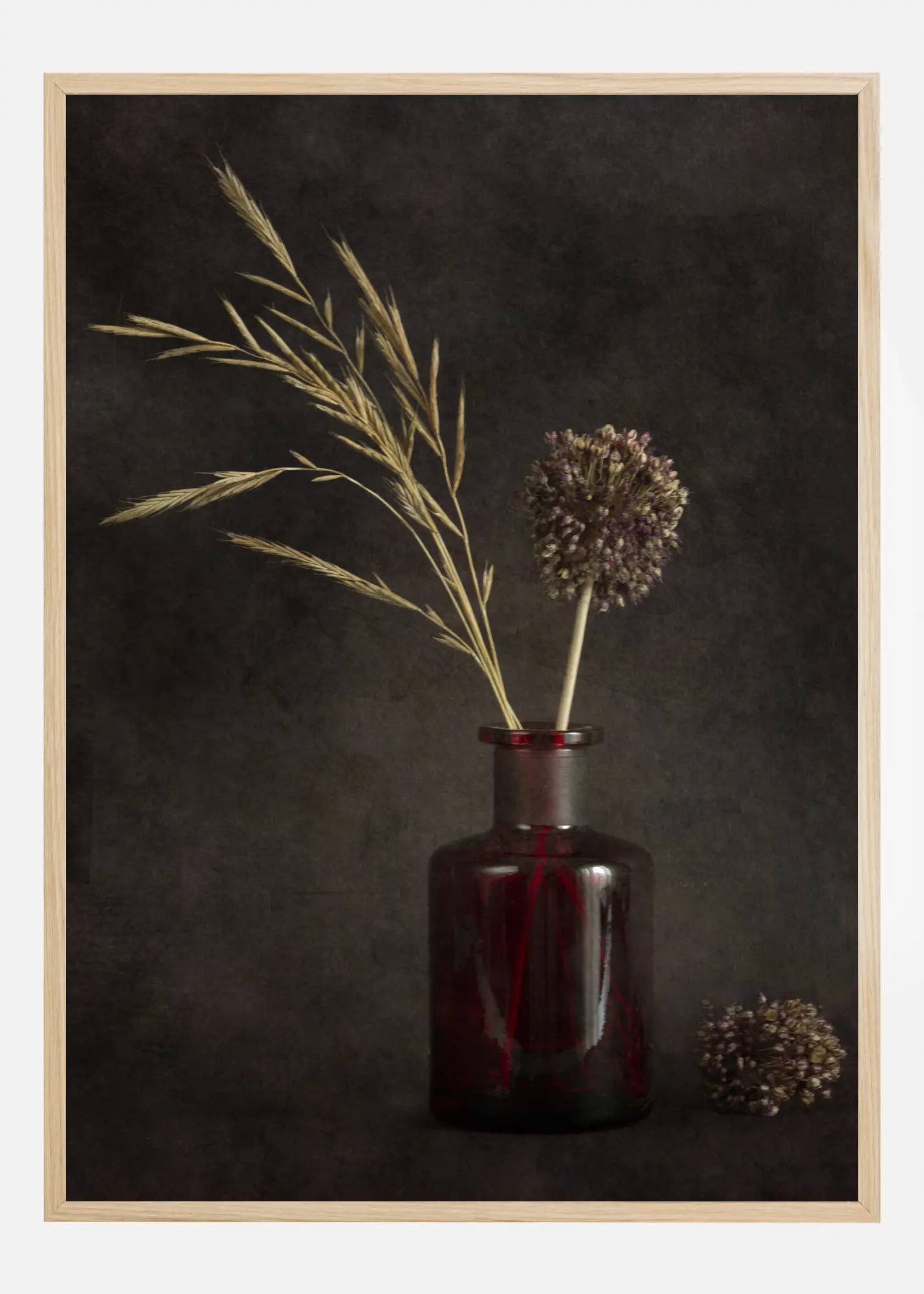 Uma bela, mas simples impressão de duas gramas secas em um frasco de vidro. Contra um fundo marrom escuro, as gramas amarelas são colocadas em um frasco vermelho. À direita do vaso, há mais uma grama seca. Um belo póster que adiciona um pouco de cor a uma parede branca.