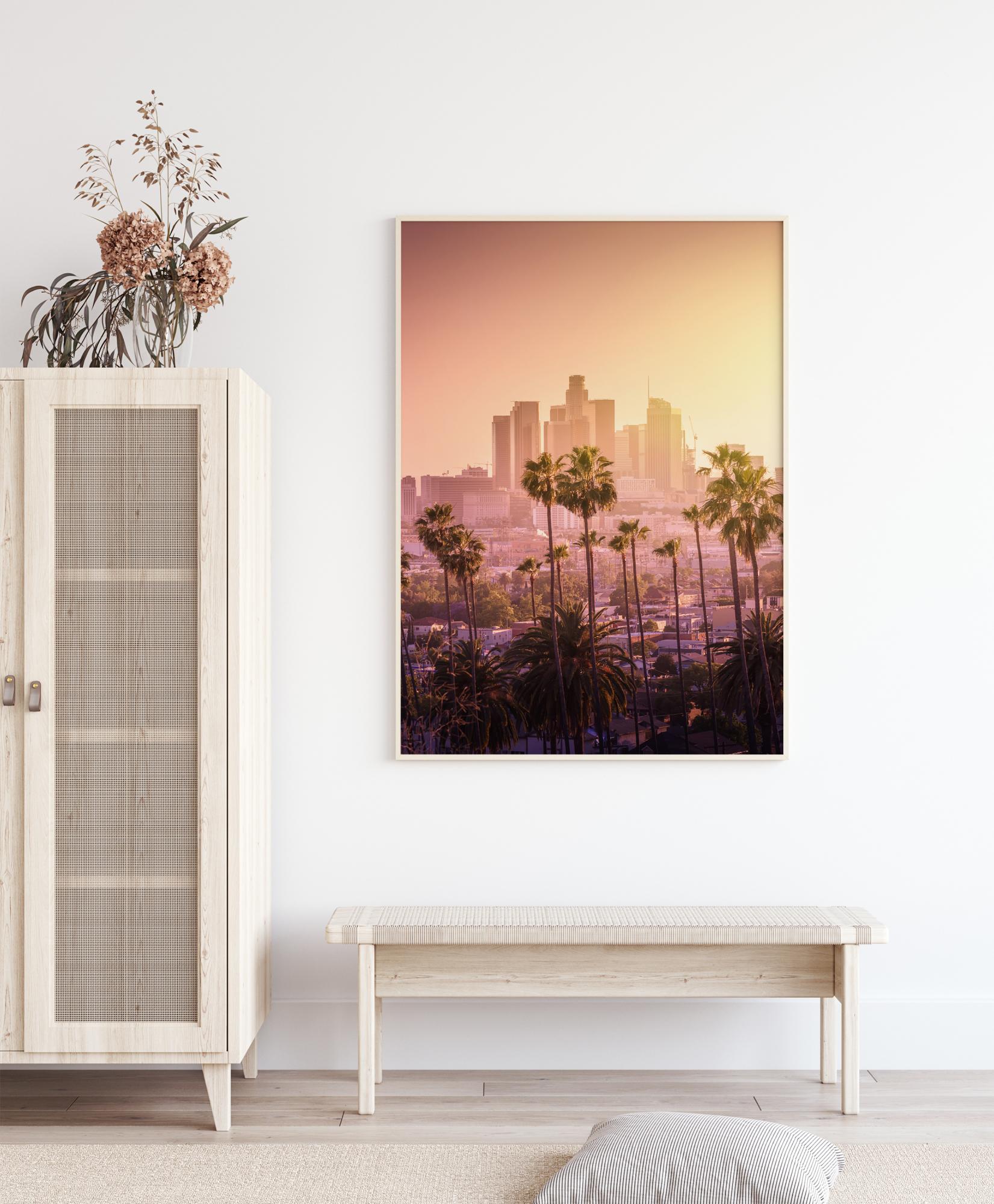 Uma foto de uma cidade tirada à distância. Na frente, as palmeiras altas dominam a imagem, enquanto os arranha-céus ao longe observam a cidade. O céu laranja e roxo reflete nos prédios da cidade, dando-lhes uma aparência roxa. Um póster perfeito para todos que amam arquitetura.