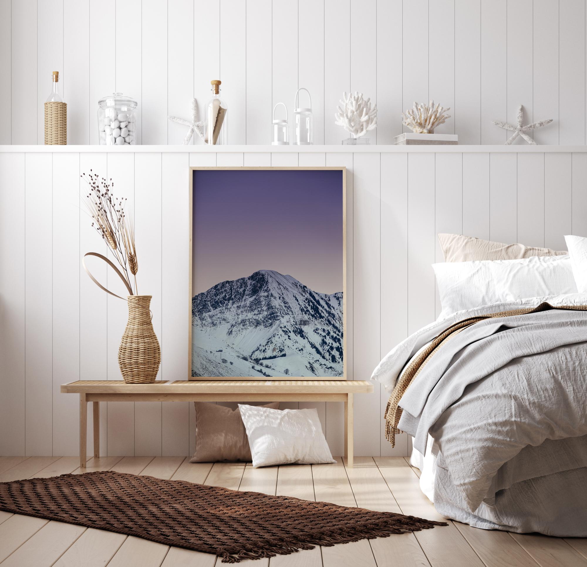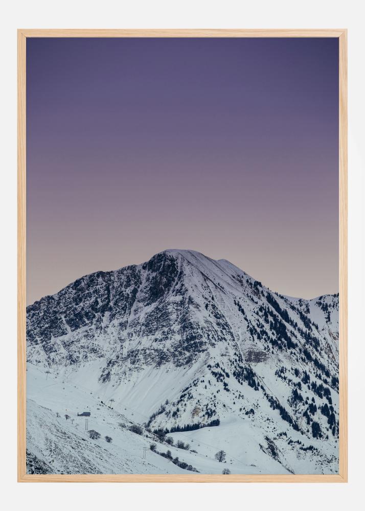 Uma imagem noturna estrelada de uma montanha branca maciça. Esta impressionante montanha coberta de neve está localizada sob um céu roxo incrível. O céu roxo é refletido nos picos das montanhas, criando uma sensação calorosa na impressão. Uma bela imagem para pendurar num ambiente frio.