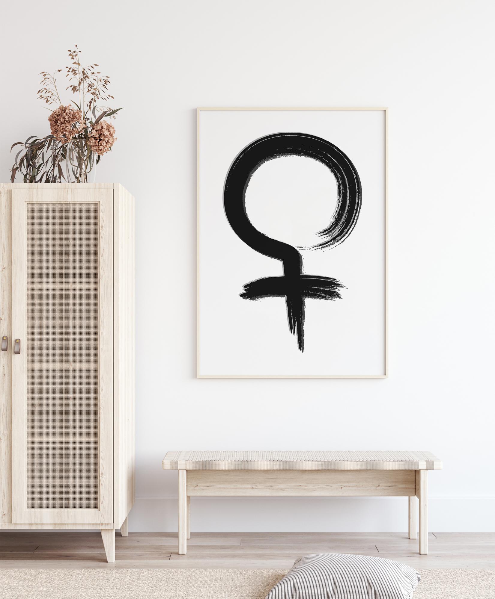 Uma impressão simples em preto e branco que ilustra o símbolo feminino com um círculo incompleto. Num fundo branco, o símbolo preto desvanece-se em direção ao final do anel. Um póster perfeito para pendurar num ambiente feminino.