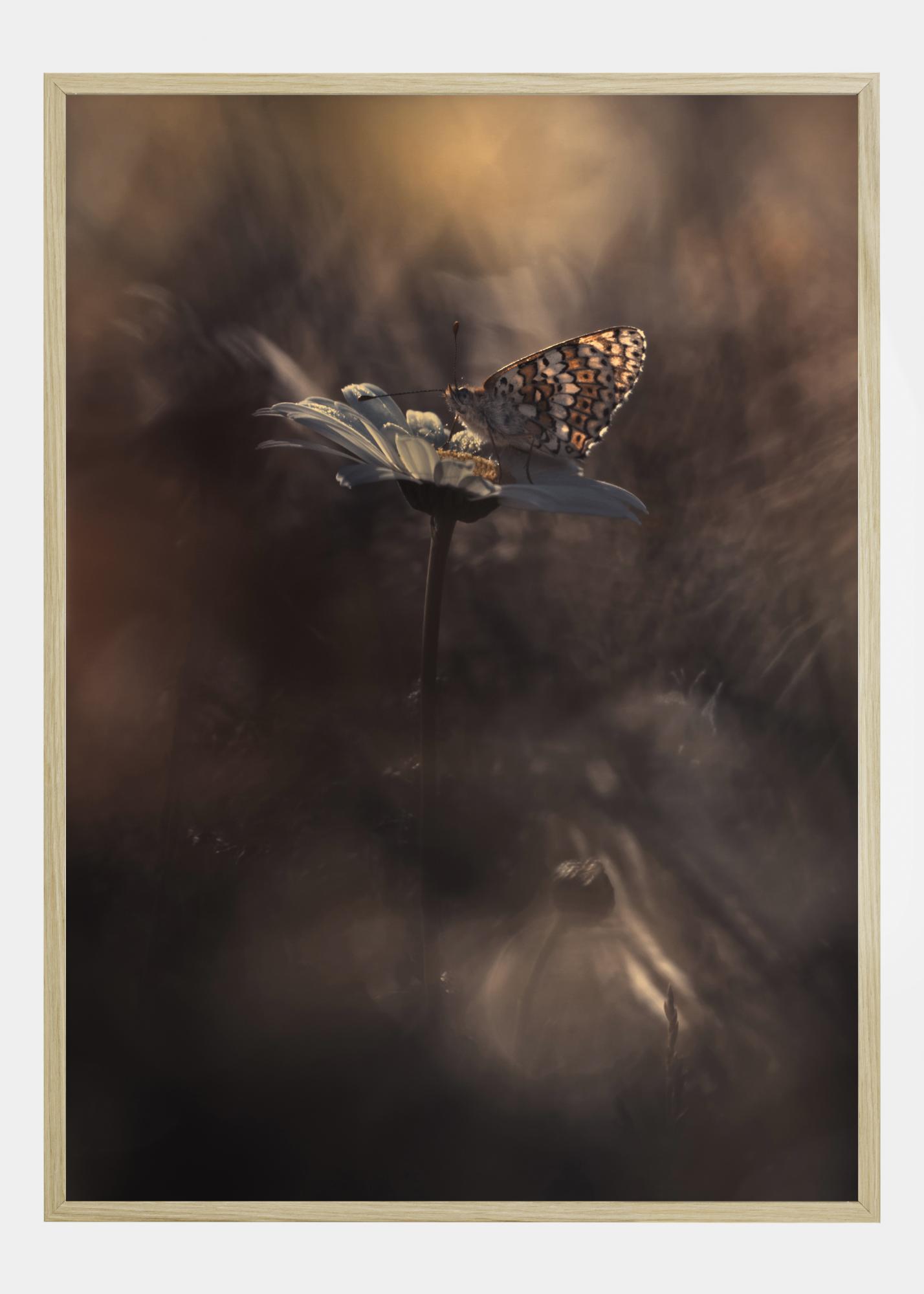 Uma impressão em close perfeita de uma borboleta laranja sentada em uma margarida de caule único. Num fundo suave e pastel, as cores borradas destacam a bela e delicada flor e borboleta. Um póster incrivelmente bonito para pendurar sobre uma lareira aberta.