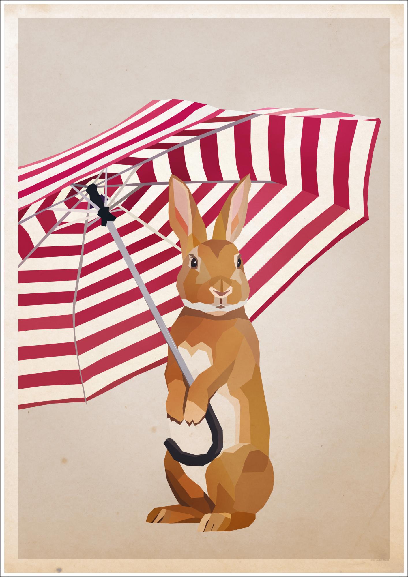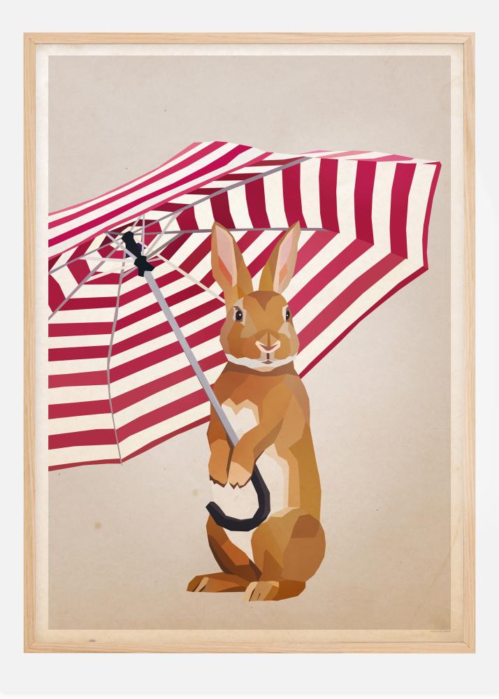 Uma obra de arte adorável com um coelho segurando um guarda-chuva entre suas duas patas dianteiras. Num fundo bege, o coelho marrom e branco segura um guarda-chuva vermelho e branco. Com os olhos do coelho olhando diretamente para a câmera, este é um póster perfeito para o quarto do seu filho.