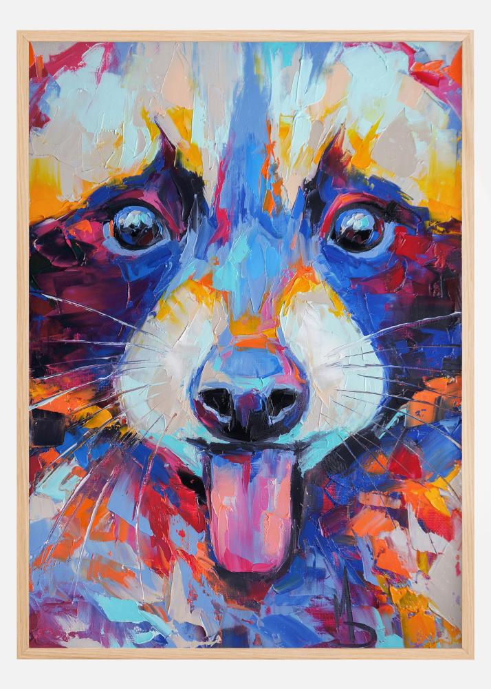 Um póster de retrato multicolorido de um guaxinim. As cores bem misturadas proporcionam uma imagem perfeita dos seus olhos azuis celestes, nariz escuro, língua rosa e bigodes preto e branco. A imagem ampliada com a assinatura do artista na parte inferior esquerda é ideal para a sala de estar ou quarto de um amante dos animais.