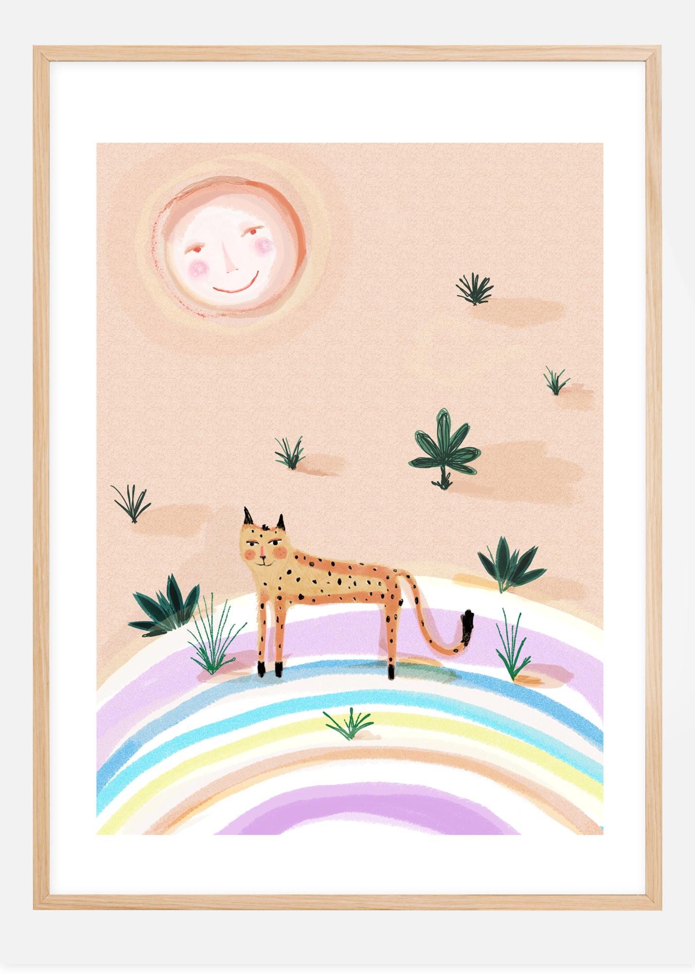 Um póster divertido do deserto com uma leopardo e um sol, ambos sorrindo. Coloquedo em uma superfície colorida, a pequena e fina leopardo está rodeada por pequenas plantas do deserto. Uma impressão ideal para pendurar no quarto do seu filho para criar uma atmosfera alegre.