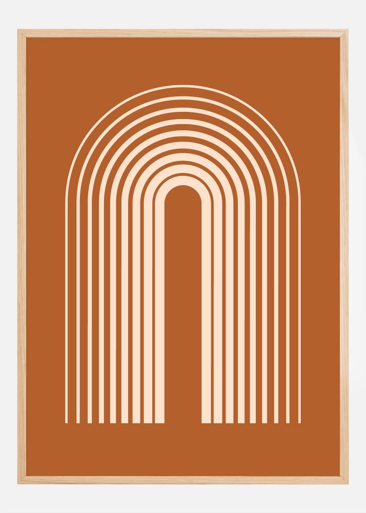 Este cartaz com um padrão de arco semicircular abstrato é uma homenagem à arte e design moderno. O padrão aparece como uma série de arcos perfeitamente simétricos em cores quentes e tonais que proporcionam uma expressão visual calmante e rítmica. O fundo de terracota progressivamente mais escuro oferece uma paisagem profunda e rica para que as linhas mais claras possam sobressair, criando um contraste dinâmico que cativa o olhar.