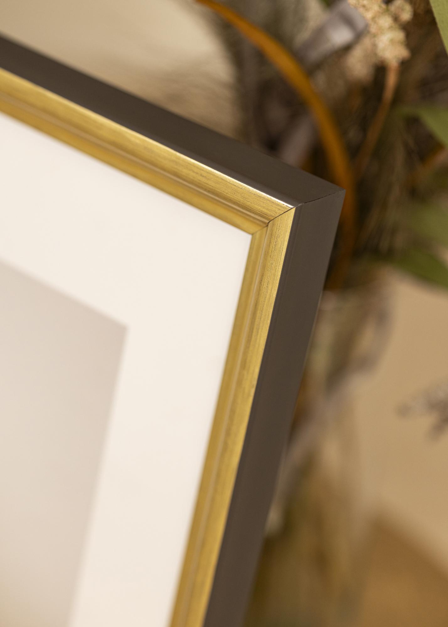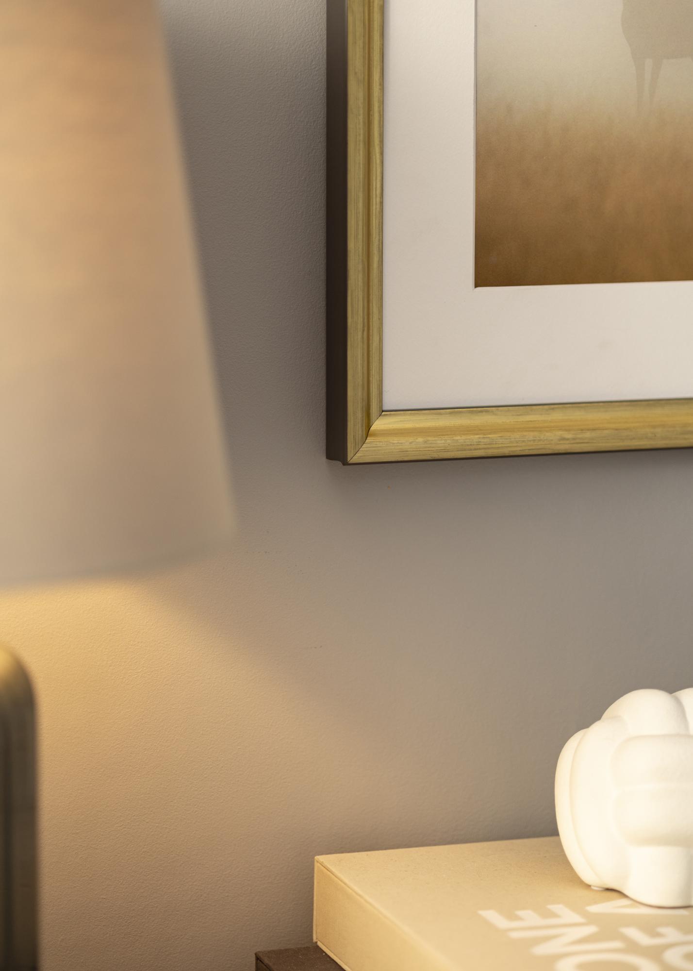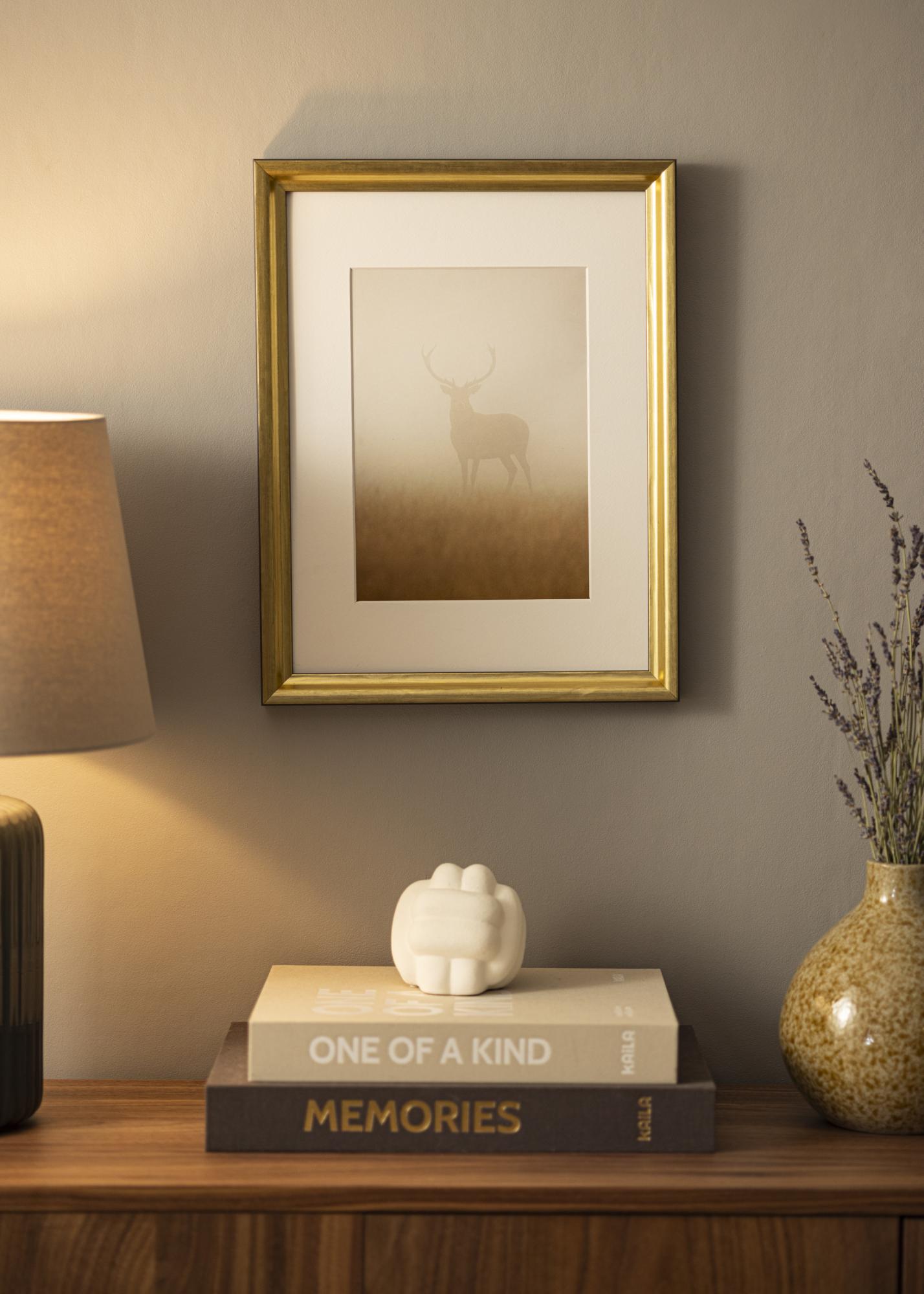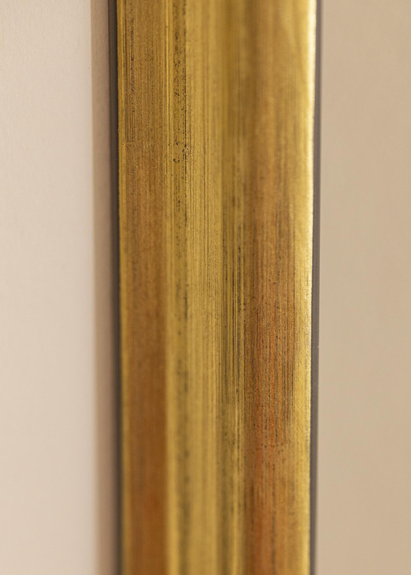 Elegante moldura dourada de tamanho médio que combina com quase todos os tipos de motivos e contextos. A moldura numa cor dourada agradável com tons pretos que dão uma impressão agradável e sóbria.