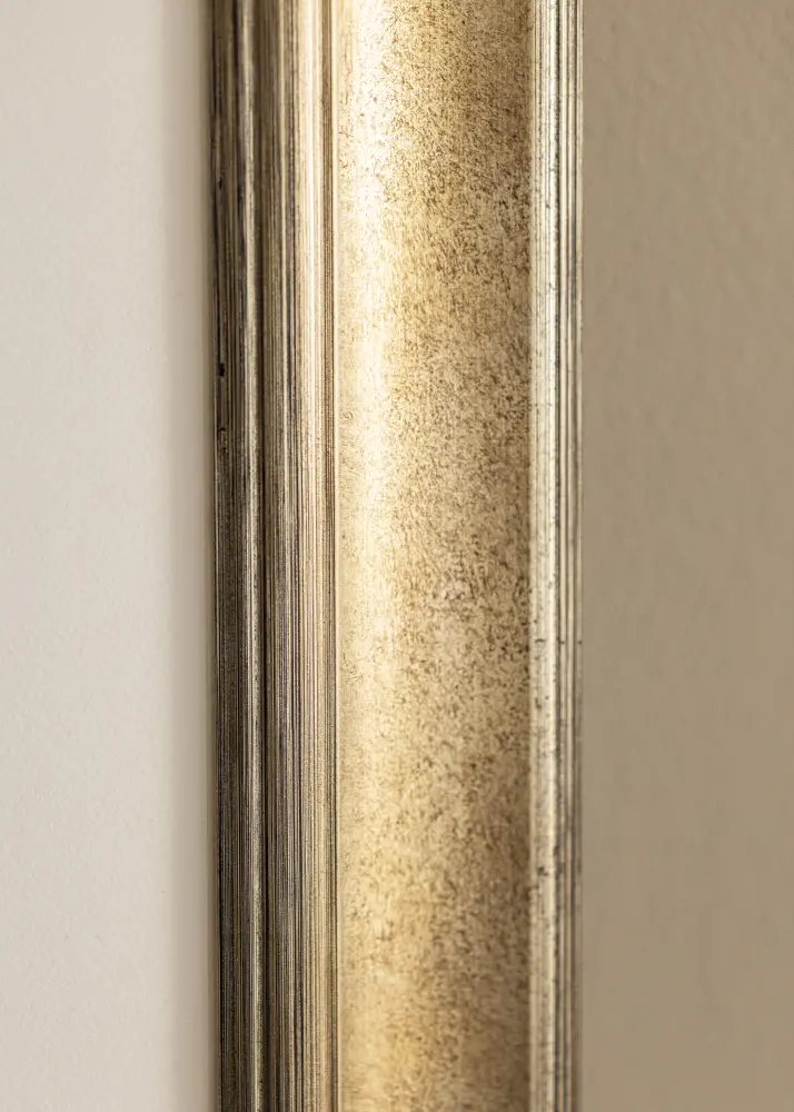 As decorações finas e lineares ao longo das bordas contribuem para o aparência elegante da moldura, enquanto a superfície escovada com sutis variações de cor destaca sua profundidade e textura. O tom de prata escura cria uma sensação clássica e atemporal que se encaixa na maioria dos estilos de decoração.