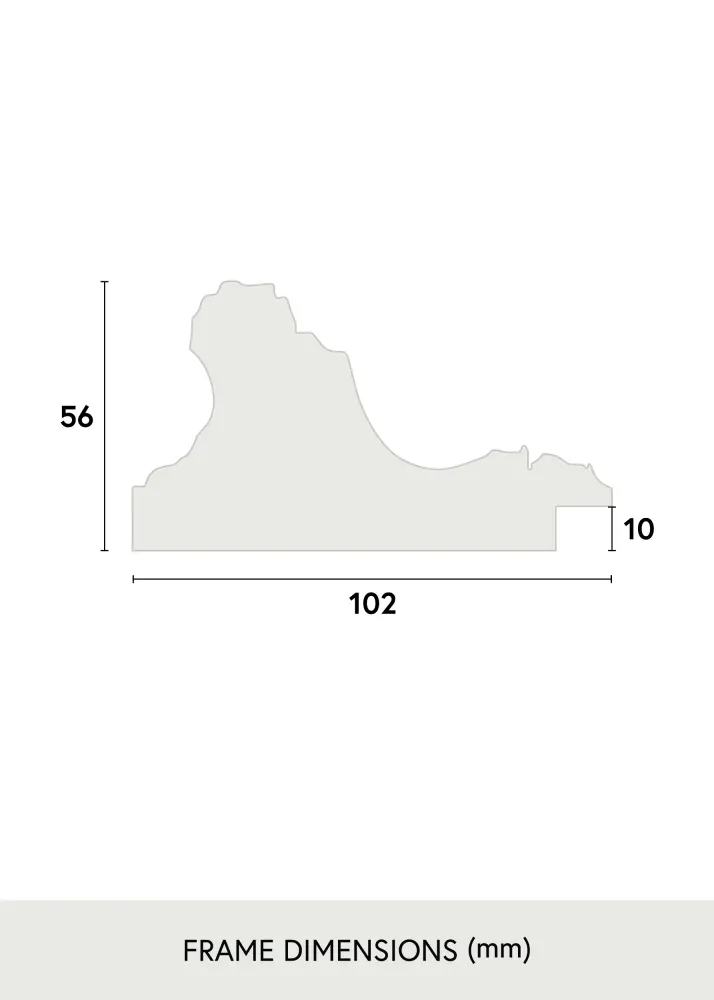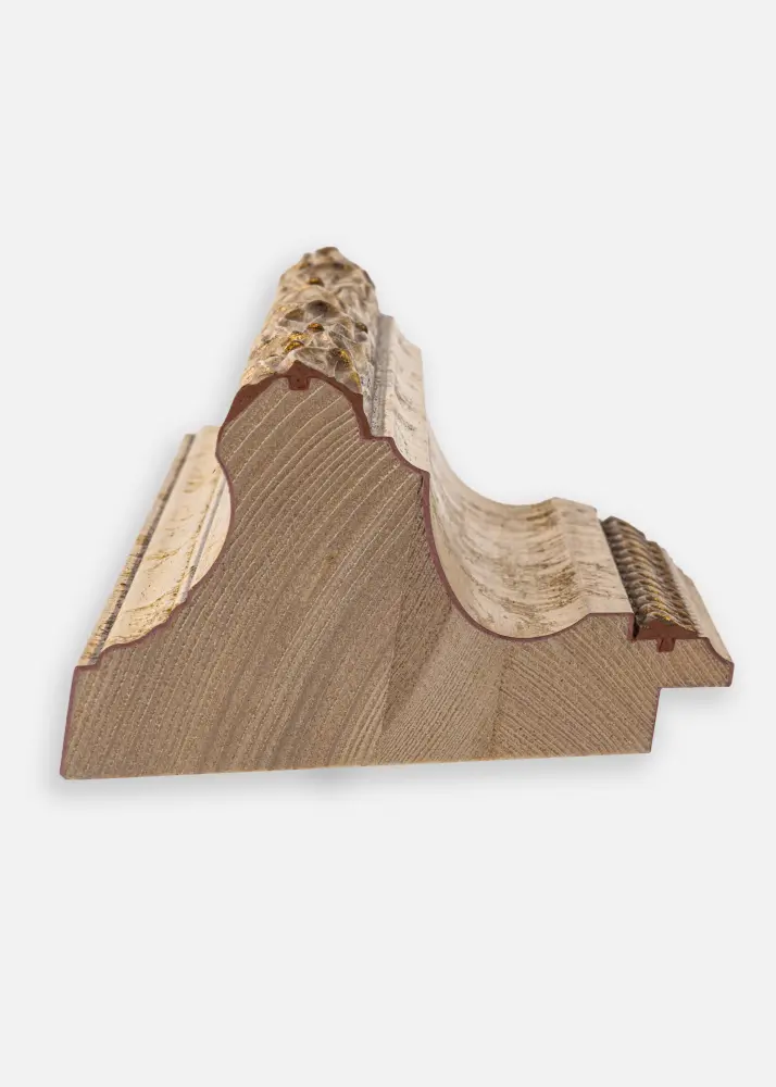 O perfil largo de 102 mm confere à moldura uma presença impressionante, enquanto sua profundidade de 56 mm cria uma moldura robusta e estável. Os pequenos ornamentos em forma de pérola ao longo da borda interna dão um toque sutil e clássico que eleva a impressão geral. A borda exterior é adornada com um padrão ondulado de folhas, o que acrescenta um caráter sofisticado e intemporal à moldura.