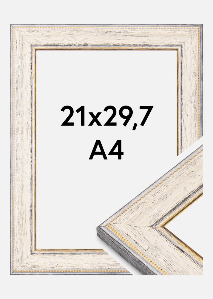 Esta bela moldura de fotos no tamanho 21x29,7 cm (A4) é uma combinação perfeita de design inspirado no vintage e funcionalidade moderna. Com seu acabamento em madeira rústica branca e cinza, complementado por detalhes sutis em dourado ao longo da borda interna, esta moldura oferece um visual encantadoramente envelhecido. O design perfilado e a estrutura clara da madeira fazem dela uma excelente escolha para estilos de decoração rústicos, shabby chic ou clássicos.