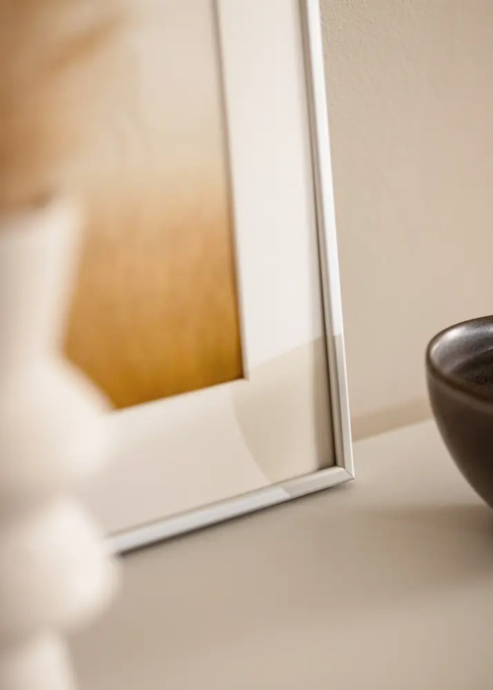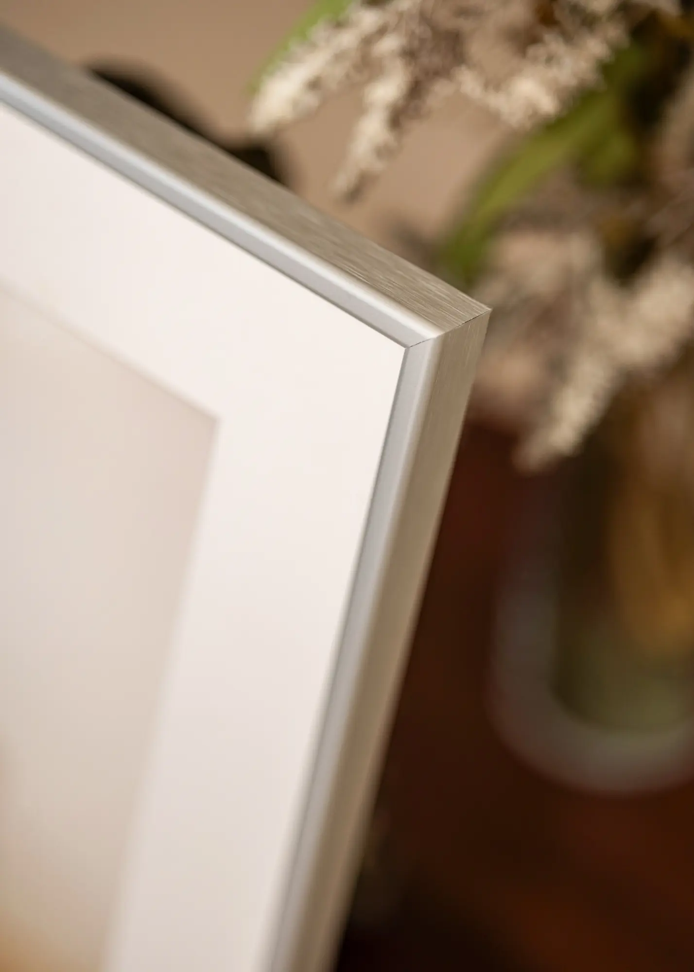 quando deseja ter uma moldura que não se destaque, mas quer que as suas belas imagens estejam no centro, "Copenhague Prata" é uma escolha adequada. Com o seu perfil estreito e brilhante em alumínio, "Copenhague Prata" transmite uma sensação de elegância e se adapta a quase todos os ambientes.