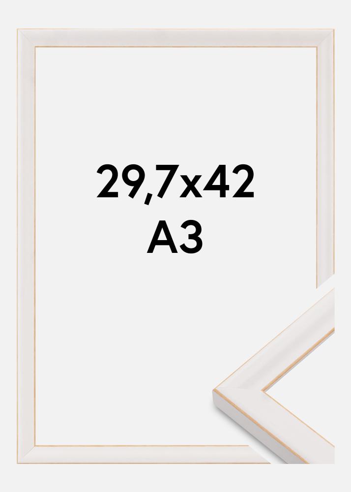 A moldura é feita de madeira e possui uma borda de 20 mm de largura e uma profundidade de 16 mm. O detalhe dourado fino ao longo da borda interna emoldura a imagem com uma sensação exclusiva. Com seu tamanho de 29,7 x 42 cm, é perfeita para temas no formato A3. Esta moldura de fotografia é equipada com ganchos de metal na parte de trás, o que facilita pendurá-la tanto horizontal como verticalmente, dependendo das suas necessidades.