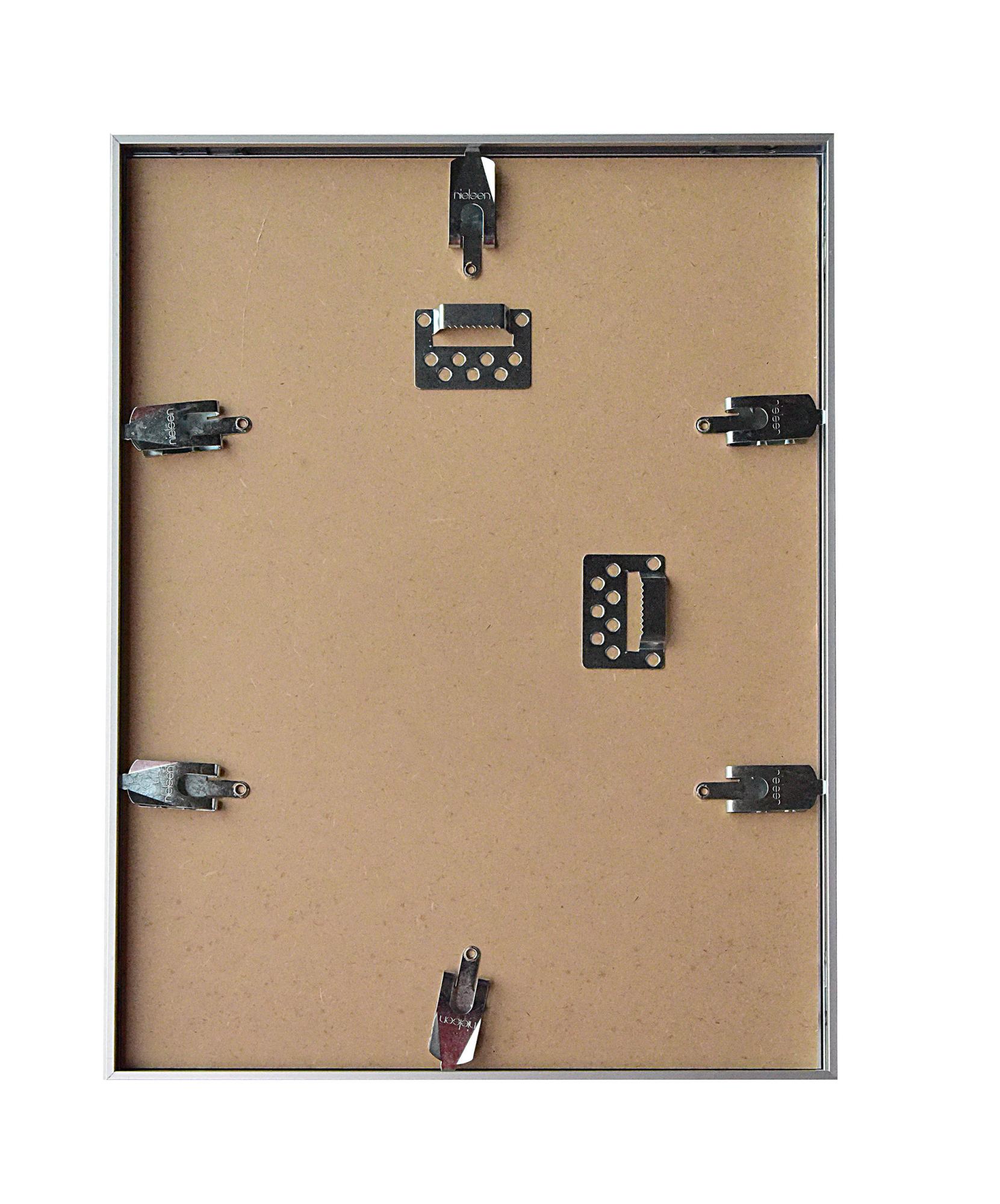 Nesta moldura, a camiseta ou outra peça de roupa fica pendurada no cartão rígido cinzento escuro incluído, o que mantém a camiseta em bom estado e protegida na moldura. A moldura tem um tom prateado mate, é feita de alumínio e possui vidro de poliestireno. A moldura mede 60x80 cm e tem uma profundidade de 22 mm, o que proporciona espaço para armazenar objetos de até 2 cm. A moldura é facilmente aberta por trás com fechos giratórios que estão no painel traseiro de MDF.