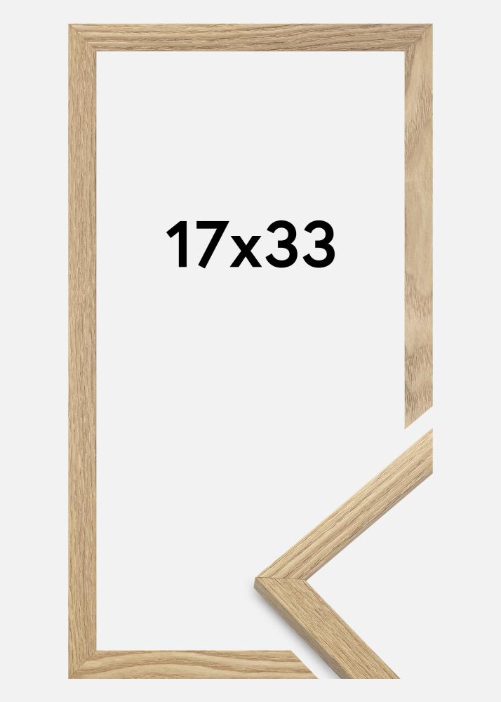 A moldura é feita de material MDF com uma superfície folheada em carvalho e tem um perfil de moldura fino de 14 mm. Há bastante espaço para complementar suas imagens com um passe-partout luxuoso, graças à profundidade interna da moldura de 12 mm.