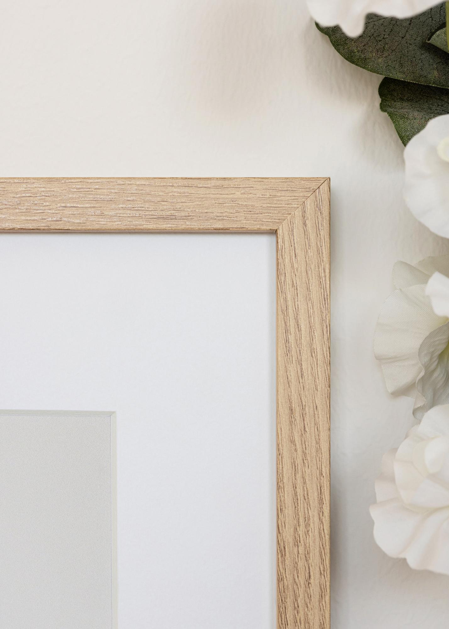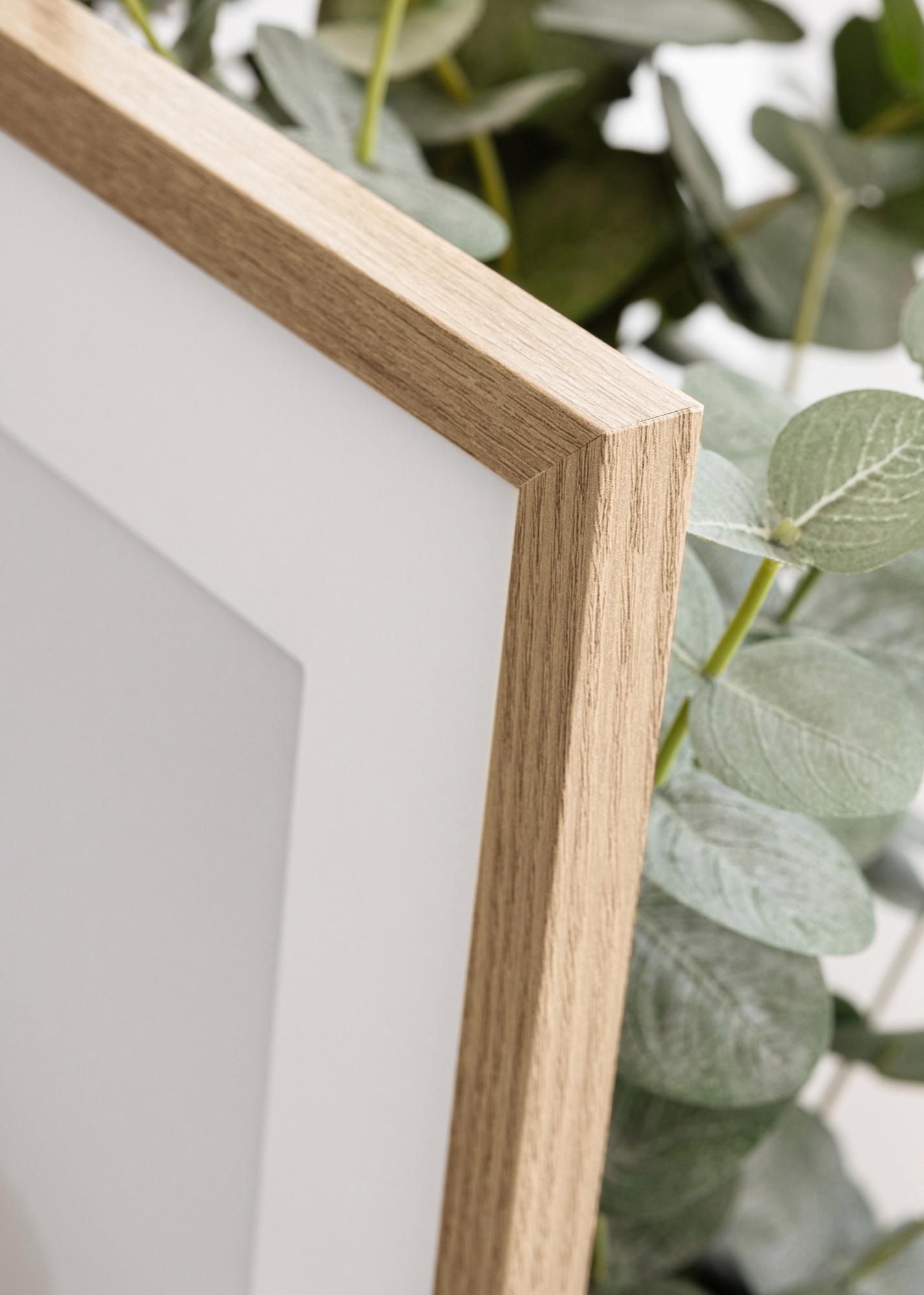 A moldura é feita de material MDF com uma superfície folheada em carvalho e tem um perfil de moldura fino de 14 mm. Há bastante espaço para complementar suas imagens com um passe-partout luxuoso, graças à profundidade interna da moldura de 12 mm.