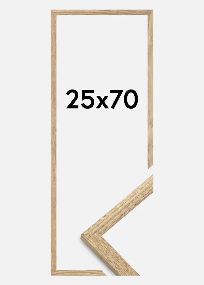 A moldura é feita de material MDF com uma superfície folheada em carvalho e tem um perfil de moldura fino de 14 mm. Há bastante espaço para complementar suas imagens com um passe-partout luxuoso, graças à profundidade interna da moldura de 12 mm.