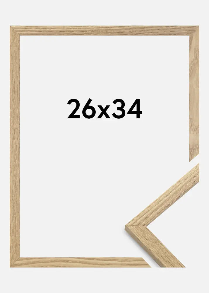 A moldura é feita de material MDF com uma superfície folheada em carvalho e tem um perfil de moldura fino de 14 mm. Há bastante espaço para complementar suas imagens com um passe-partout luxuoso, graças à profundidade interna da moldura de 12 mm.