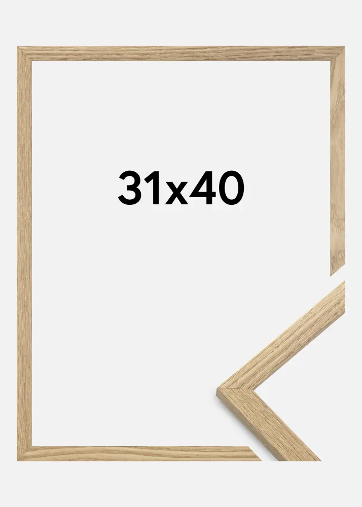A moldura é feita de material MDF com uma superfície folheada em carvalho e tem um perfil de moldura fino de 14 mm. Há bastante espaço para complementar suas imagens com um passe-partout luxuoso, graças à profundidade interna da moldura de 12 mm.