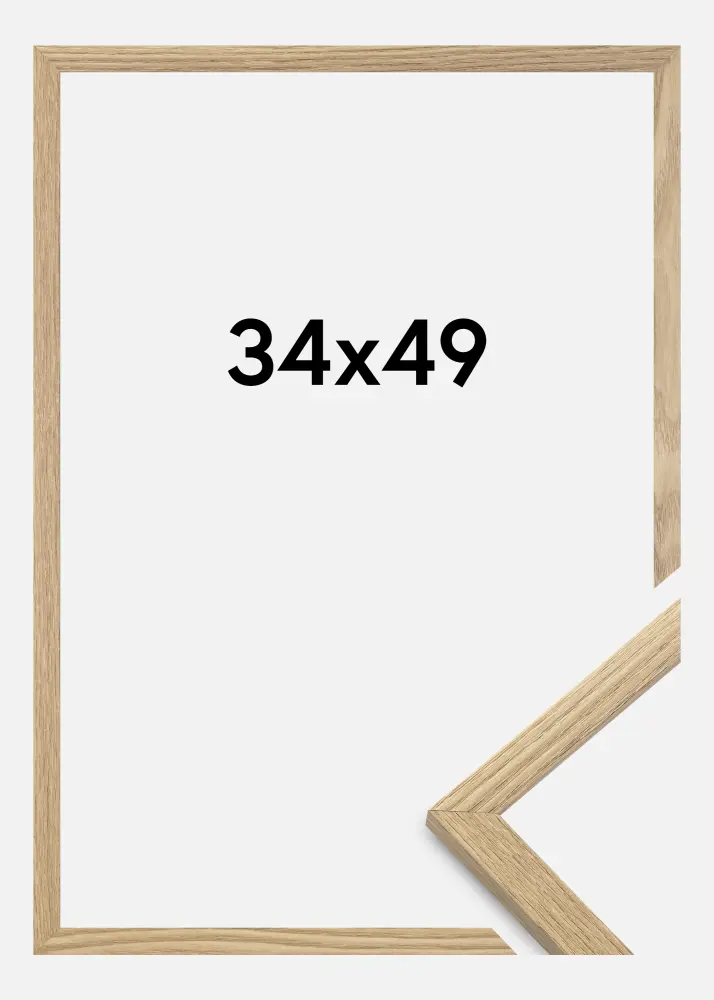 A moldura é feita de material MDF com uma superfície folheada em carvalho e tem um perfil de moldura fino de 14 mm. Há bastante espaço para complementar suas imagens com um passe-partout luxuoso, graças à profundidade interna da moldura de 12 mm.