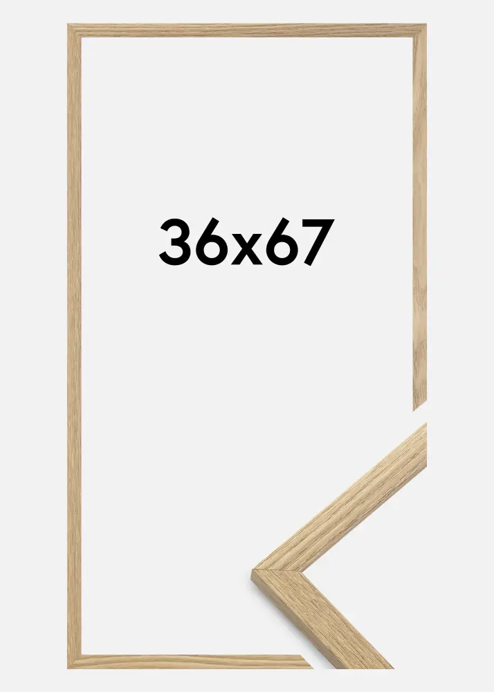 A moldura é feita de material MDF com uma superfície folheada em carvalho e tem um perfil de moldura fino de 14 mm. Há bastante espaço para complementar suas imagens com um passe-partout luxuoso, graças à profundidade interna da moldura de 12 mm.