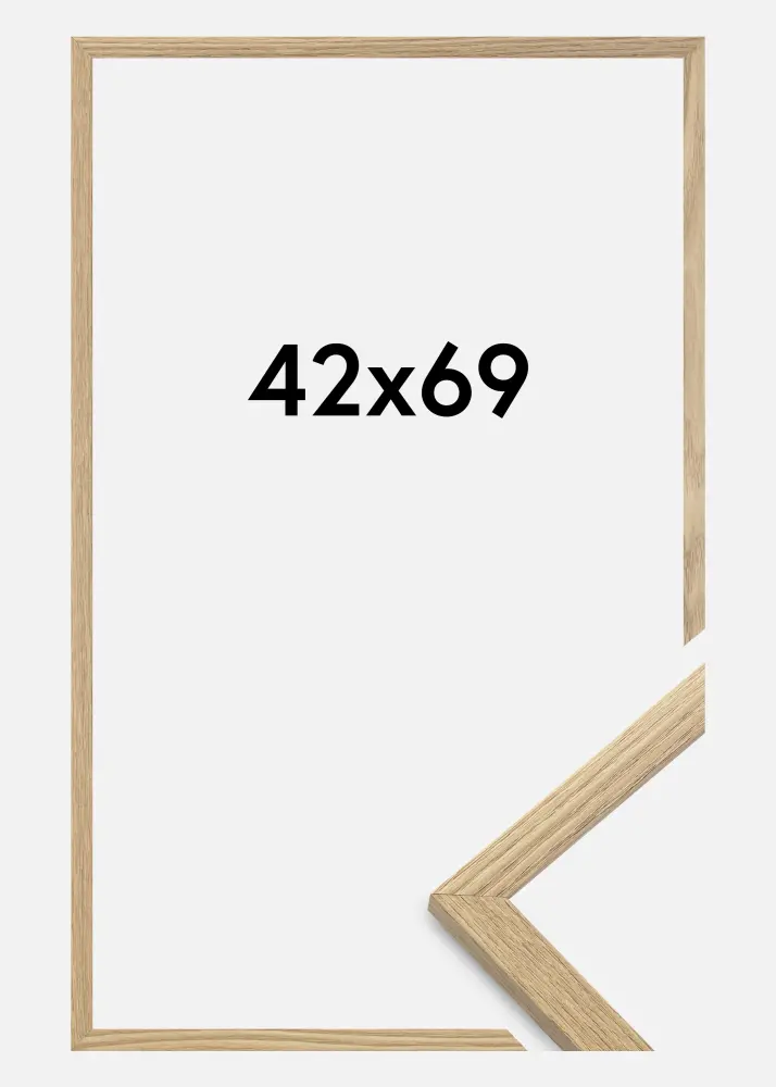 A moldura é feita de material MDF com uma superfície folheada em carvalho e tem um perfil de moldura fino de 14 mm. Há bastante espaço para complementar suas imagens com um passe-partout luxuoso, graças à profundidade interna da moldura de 12 mm.