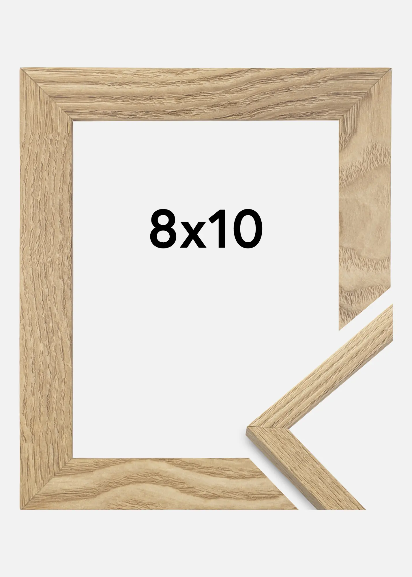 A moldura é feita de material MDF com uma superfície folheada em carvalho e tem um perfil de moldura fino de 14 mm. Há bastante espaço para complementar suas imagens com um passe-partout luxuoso, graças à profundidade interna da moldura de 12 mm.
