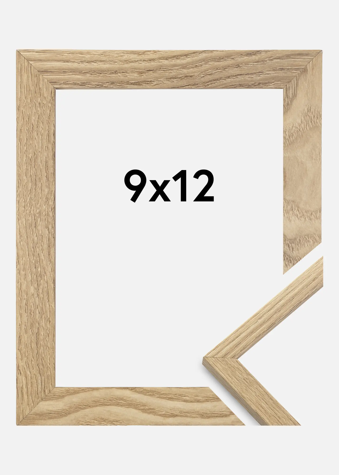 A moldura é feita de material MDF com uma superfície folheada em carvalho e tem um perfil de moldura fino de 14 mm. Há bastante espaço para complementar suas imagens com um passe-partout luxuoso, graças à profundidade interna da moldura de 12 mm.