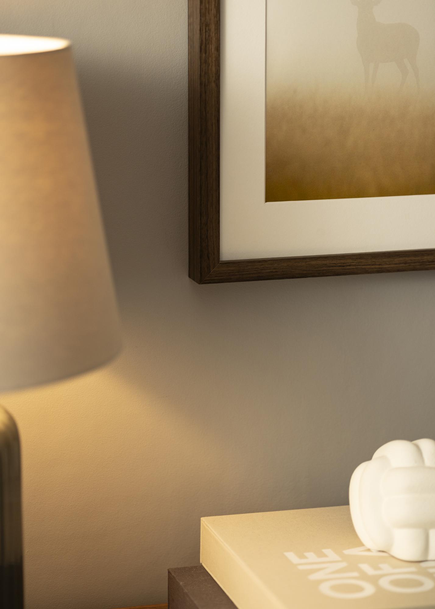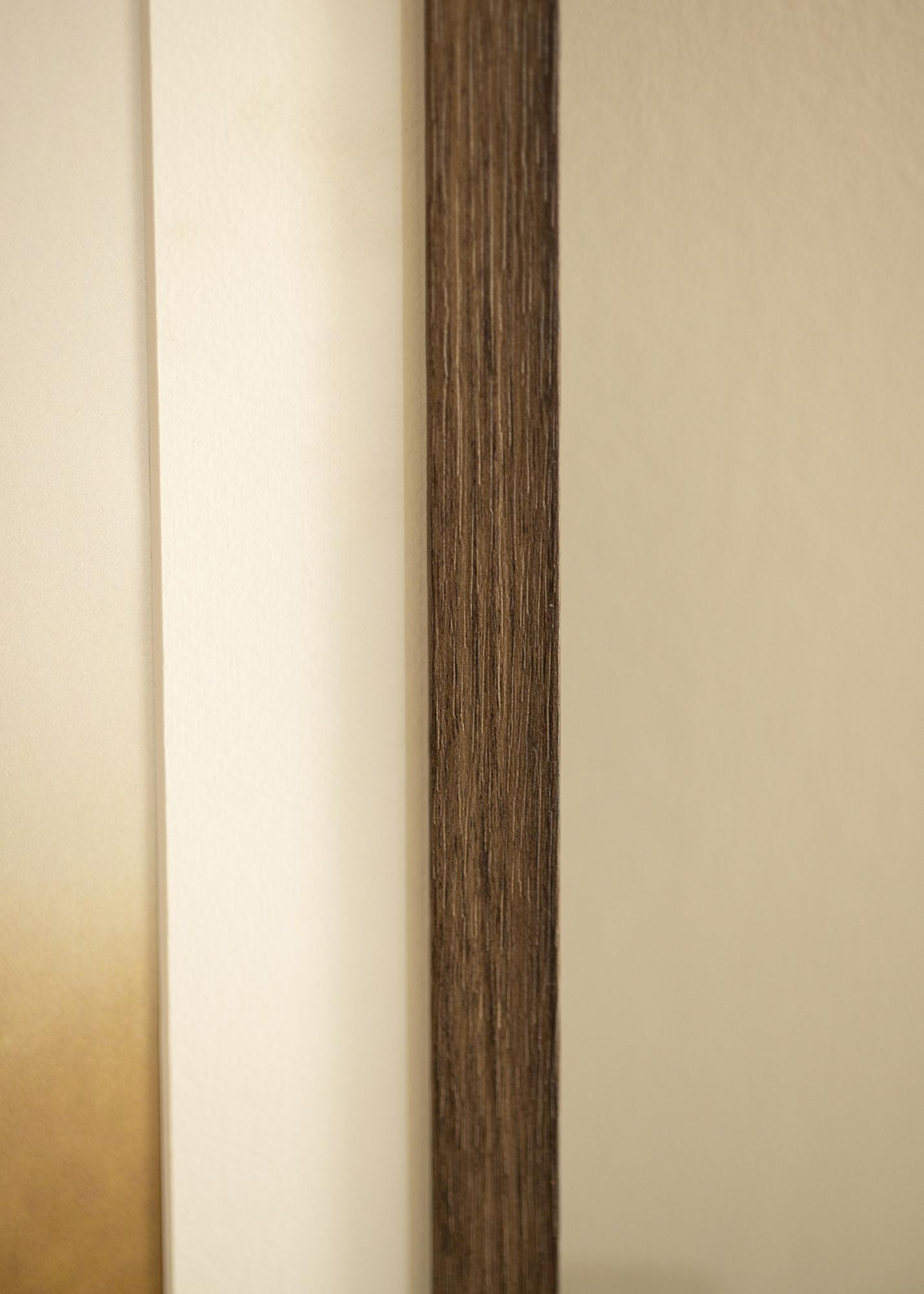 A moldura possui uma lista de 21 mm de largura e uma profundidade de 38 mm, proporcionando uma sensação estável e robusta sem ofuscar o motivo. As bordas retas e o perfil fino contribuem para um design moderno e elegante que se integra facilmente a diferentes estilos de decoração. As sutis variações de cor nos veios adicionam profundidade e variação, tornando cada moldura única.