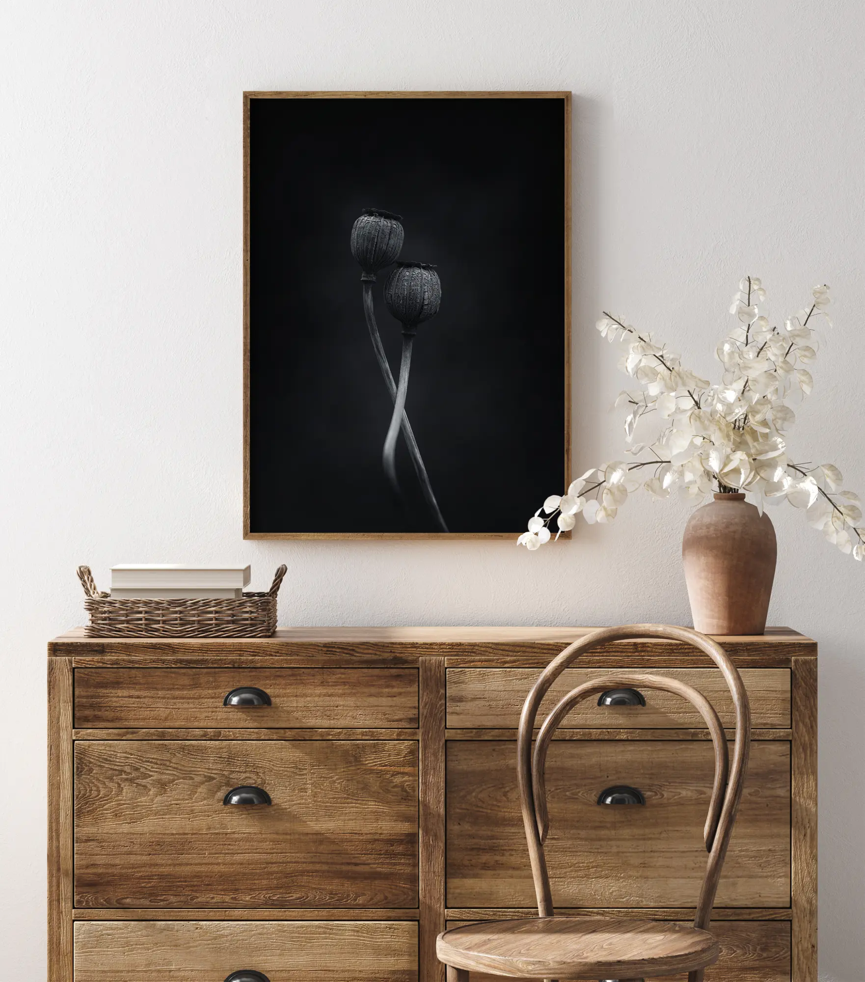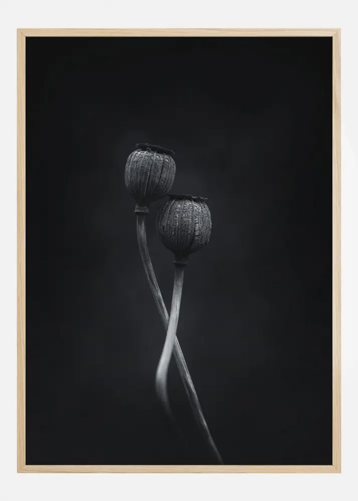 Um póster detalhado da natureza com duas cápsulas de sementes entrelaçadas de papoula. Esta foto pitoresca transmite a sensação de dois dançarinos. Sinta o amor e a elegância ao pendurar este póster em casa.