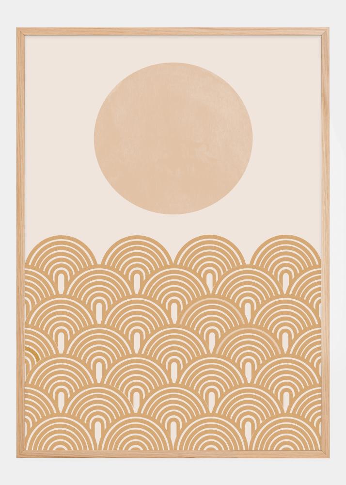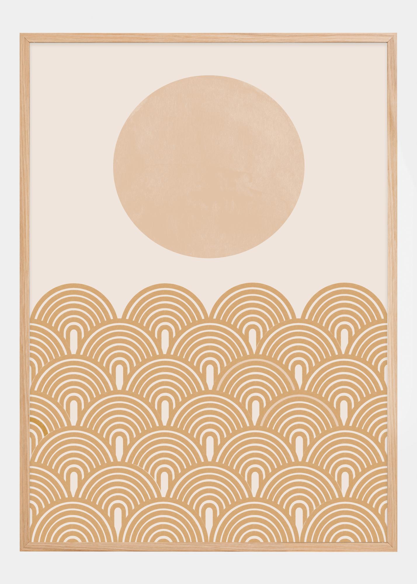 Este pôster é uma interpretação ensolarada de estilos retrô e vibrações de verão, onde um grande círculo rosa claro flutua acima de um padrão de elementos arqueados em um tom terracota quente. Os arcos estão interligados de uma forma que lembra ondas ou colinas, dando uma sensação de movimento e vivacidade. A paleta de cores suave contribui para uma sensação de calor e tranquilidade.