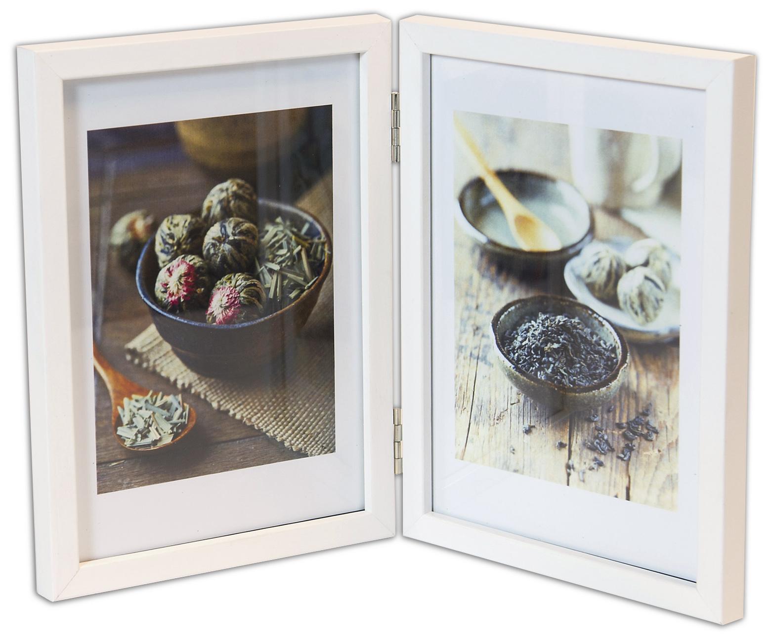 A moldura branca Moldura dobrável tem espaço para 2 fotografias. A moldura tem um perfil moderno e quadrado feito de madeira branca lacada.