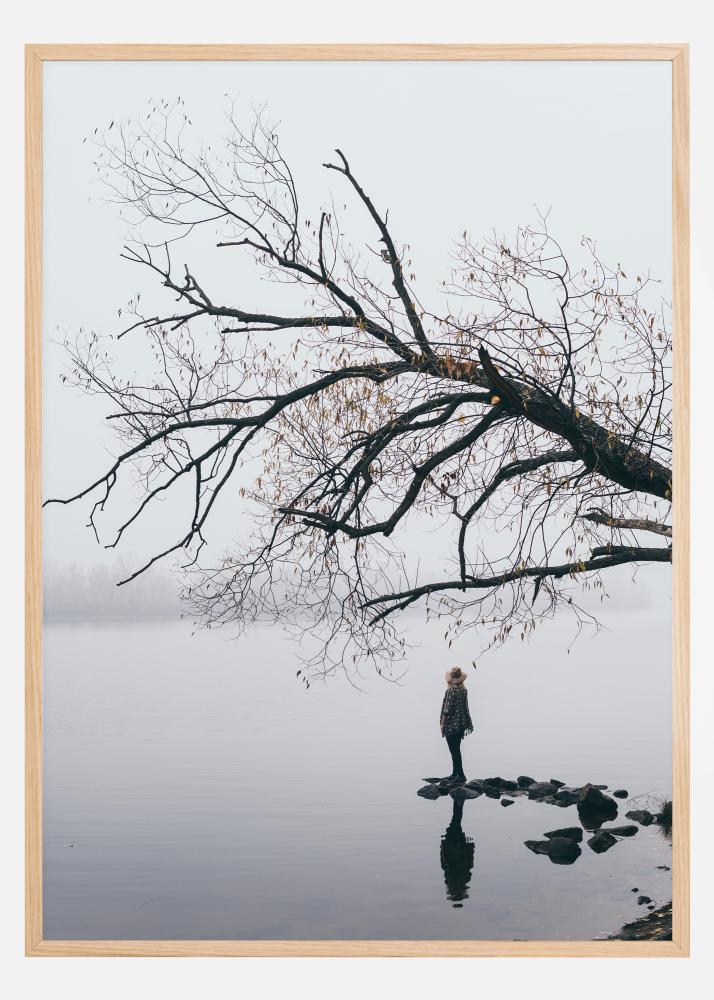 Um póster com vista para o mar de uma mulher em pé em um pequeno cais de pedra em um lago, enquanto uma árvore se curva sobre ela. O lago branco combina com um céu da mesma cor. A mulher se destaca em contraste enquanto ela olha para a água em contemplação tranquila. Traga a tranquilidade para sua casa com essa imagem da natureza.