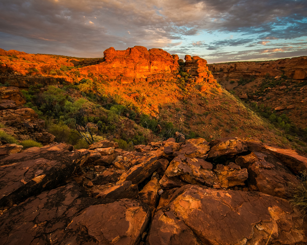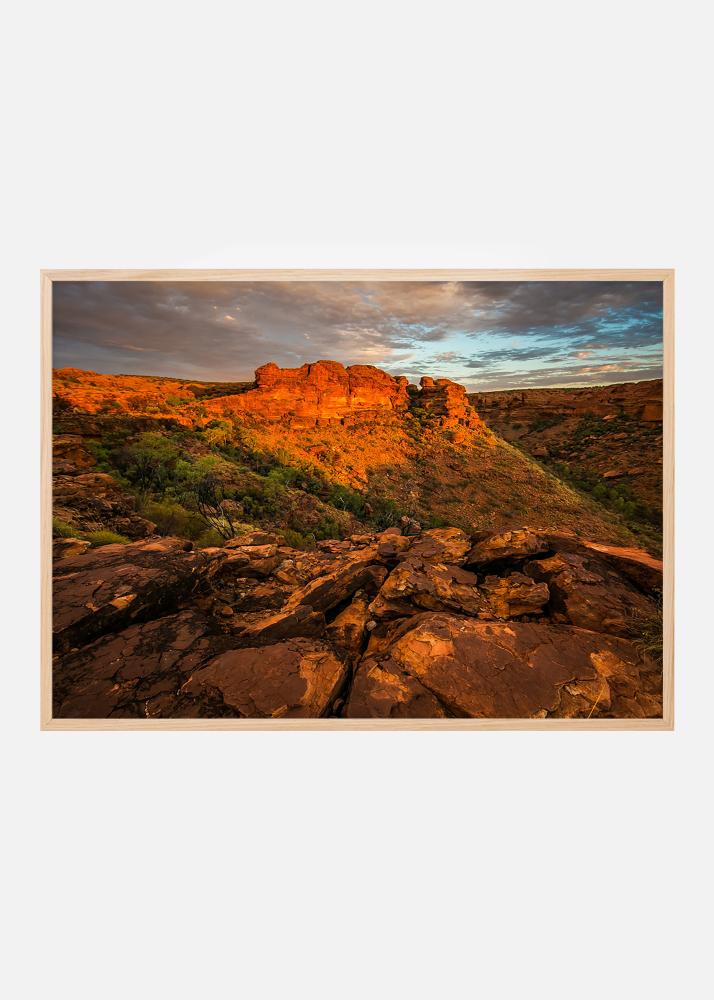 Póster com fotografia de montanhas vermelhas áridas ao pôr-do-sol, algo para quem gosta de desertos e formações rochosas para pendurar na parede. Os tons quentes de vermelho contra o céu azul-gelo e a profundidade da imagem criam um motivo interessante. Emoldure o cartaz com uma moldura para fotos elegante e coloque-o numa galeria de parede junto com outros motivos de deserto.