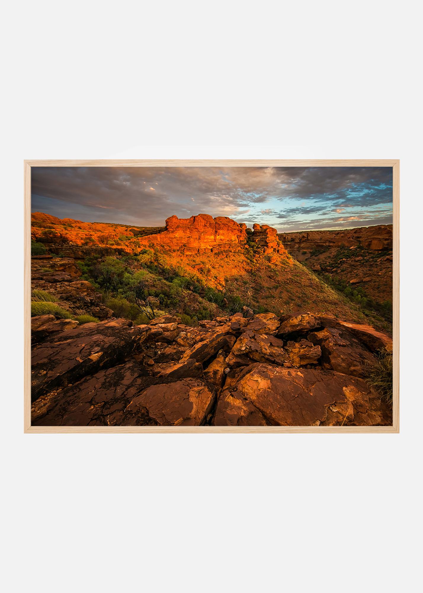 Póster com fotografia de montanhas vermelhas áridas ao pôr-do-sol, algo para quem gosta de desertos e formações rochosas para pendurar na parede. Os tons quentes de vermelho contra o céu azul-gelo e a profundidade da imagem criam um motivo interessante. Emoldure o cartaz com uma moldura para fotos elegante e coloque-o numa galeria de parede junto com outros motivos de deserto.