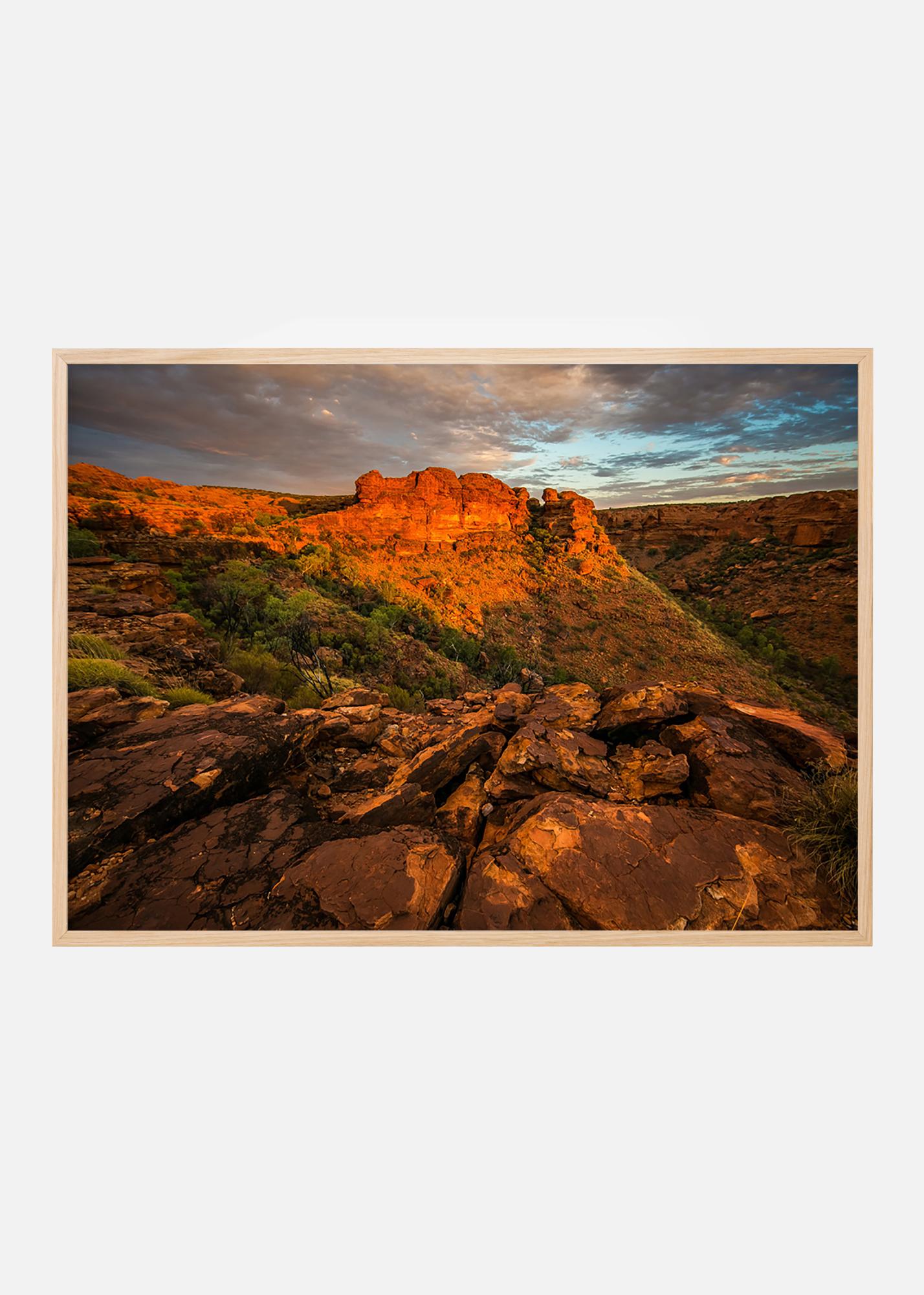 Póster com fotografia de montanhas vermelhas áridas ao pôr-do-sol, algo para quem gosta de desertos e formações rochosas para pendurar na parede. Os tons quentes de vermelho contra o céu azul-gelo e a profundidade da imagem criam um motivo interessante. Emoldure o cartaz com uma moldura para fotos elegante e coloque-o numa galeria de parede junto com outros motivos de deserto.