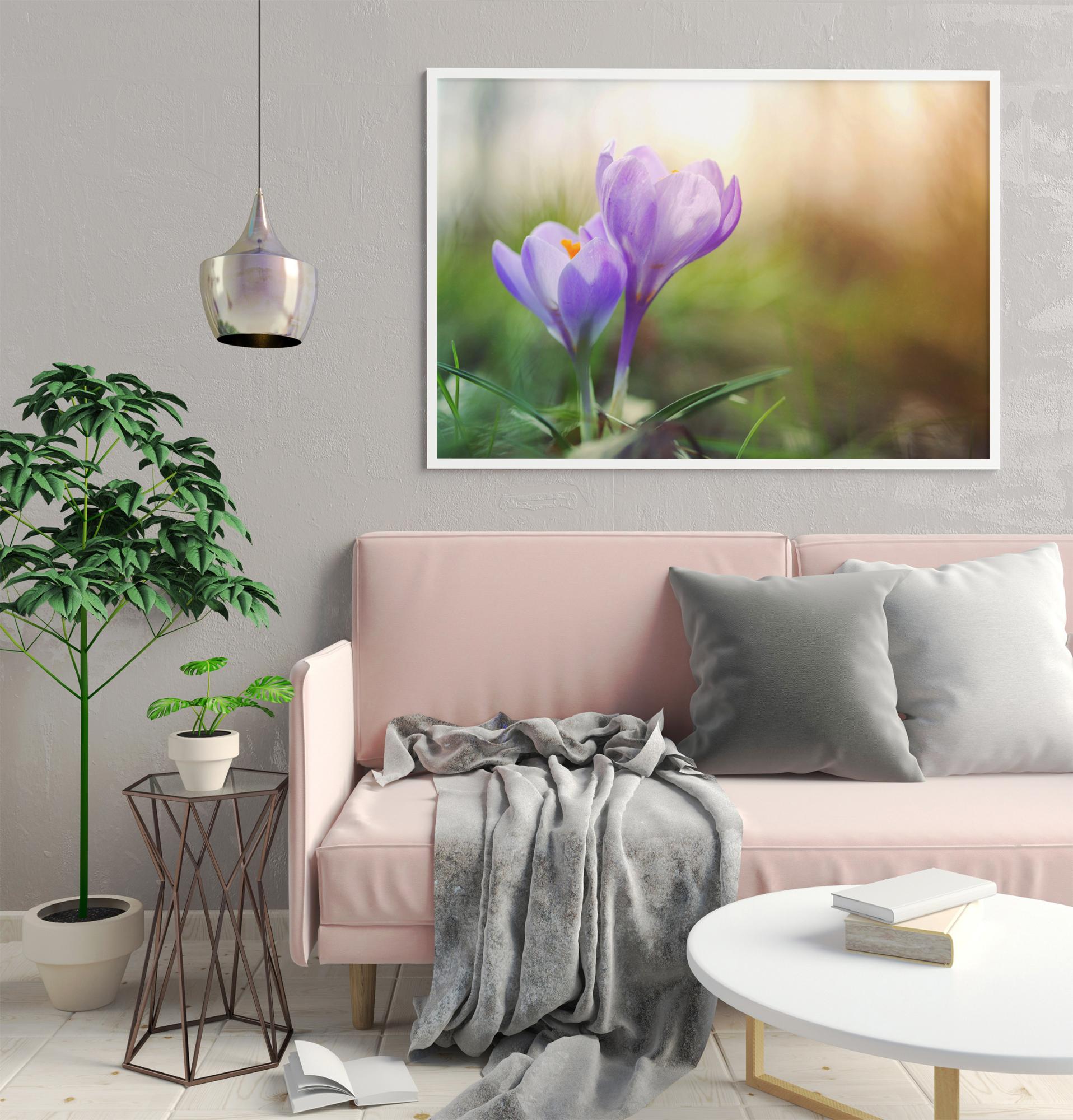 Uma encantadora imagem do talvez mais colorido adorador do sol da primavera, o crocus. O fundo desfocado em cor complementar realça as flores e traz harmonia à fotografia. Perfeito para quem deseja ter alegria de cores em casa e sempre é bom usar uma tonalidade da pintura como cor de destaque na decoração. Combine com outros motivos de plantas para criar uma sensação de totalidade no ambiente.