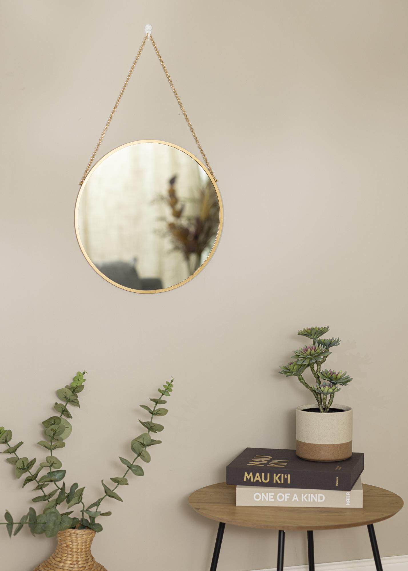Deixe este espelho de parede adicionar elegância à sua casa! O espelho tem uma aparência sofisticada com uma forma redonda e uma moldura de espelho fina com apenas 8 mm de profundidade. A moldura elegante é feita de metal e numa cor dourada exclusiva. A impressão elegante é completada pela corrente de ouro usada para pendurar.