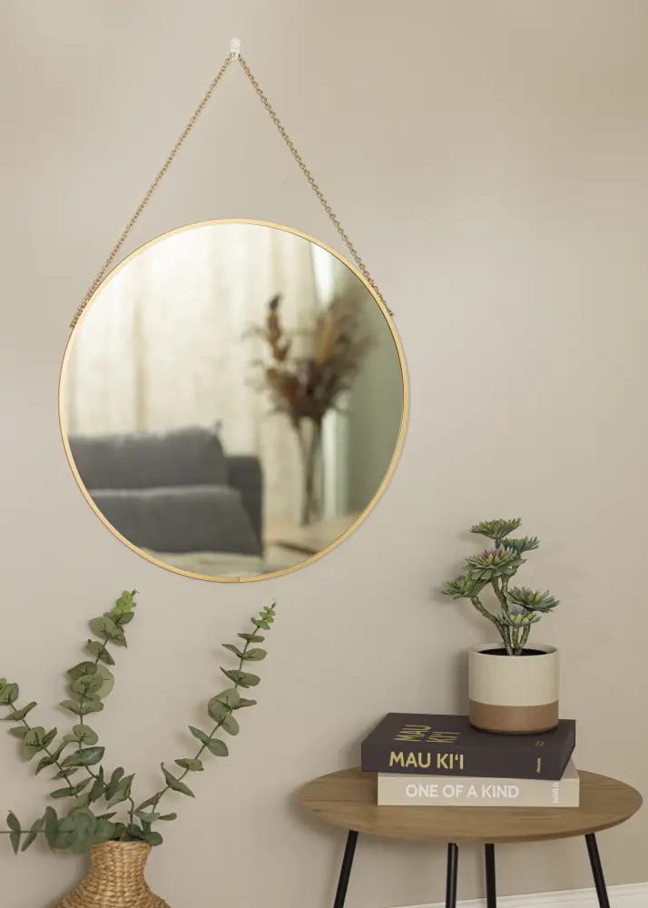 Deixe este espelho de parede adicionar elegância à sua casa! O espelho tem uma aparência sofisticada com uma forma redonda e uma moldura de espelho fina com apenas 8 mm de profundidade. A moldura elegante é feita de metal e numa cor dourada exclusiva. A impressão elegante é completada pela corrente de ouro usada para pendurar.