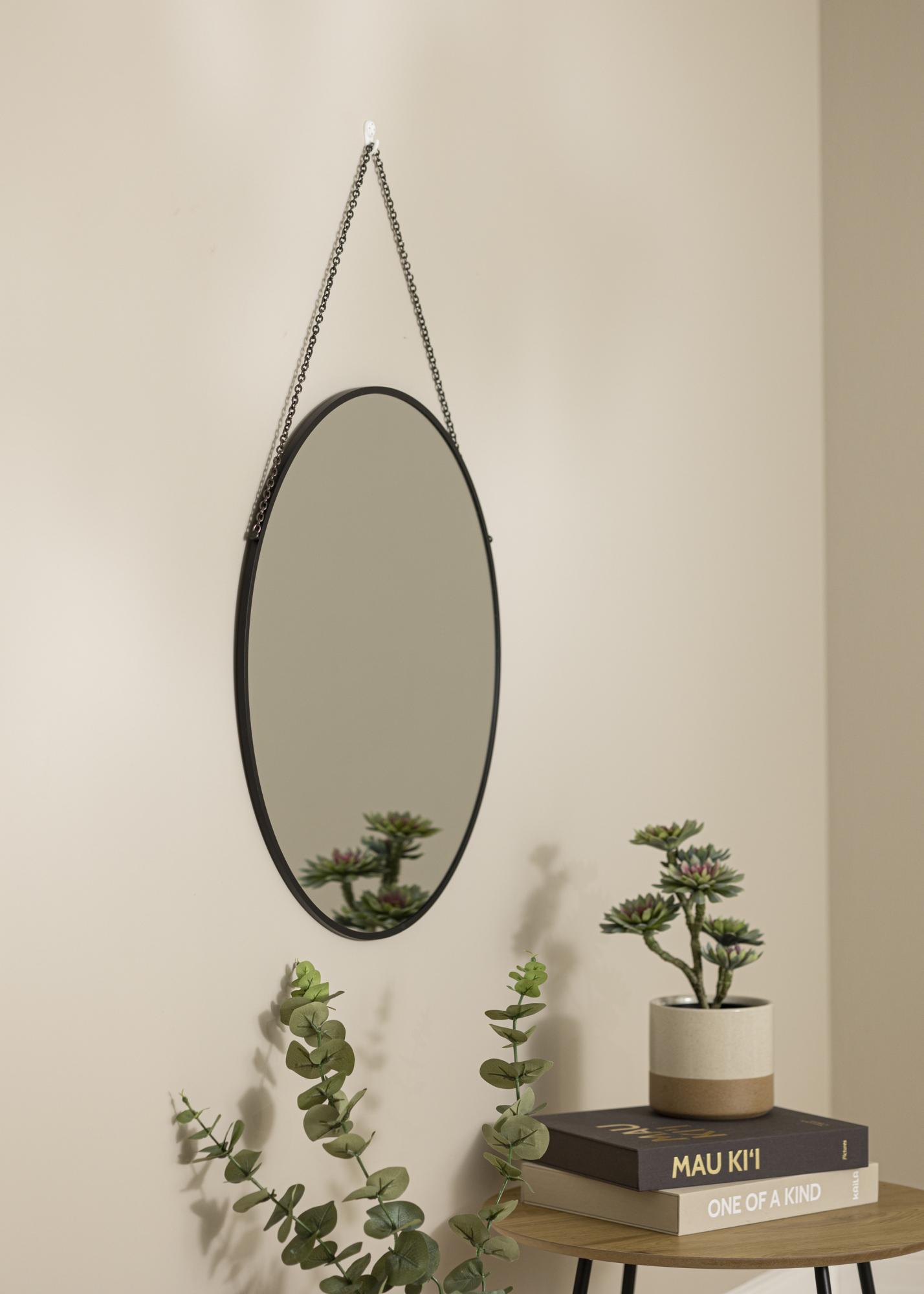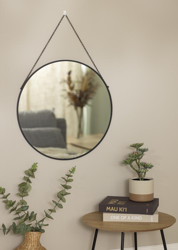 Um espelho pendurado na parede numa corrente tem uma aparência especial que dá uma expressão muito decorativa a qualquer sala. Este espelho redondo de parede é montado numa corrente de metal preta, que combina perfeitamente com a moldura de metal preta do espelho. A moldura tem apenas 8 mm de profundidade, o que confere-lhe uma aparência delicada e elegante.