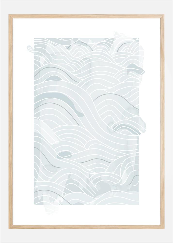 Um póster marítimo com linhas abstratas e ondas azuis suaves num fundo branco. Diferentes tons de azul e espessuras de linha são combinados para criar essas ondas fluidas pela página. deixe a sua mente vagar e se deixe envolver por esse padrão marítimo suave.
