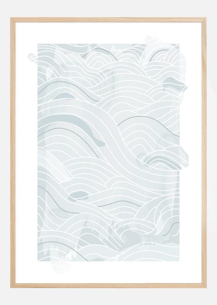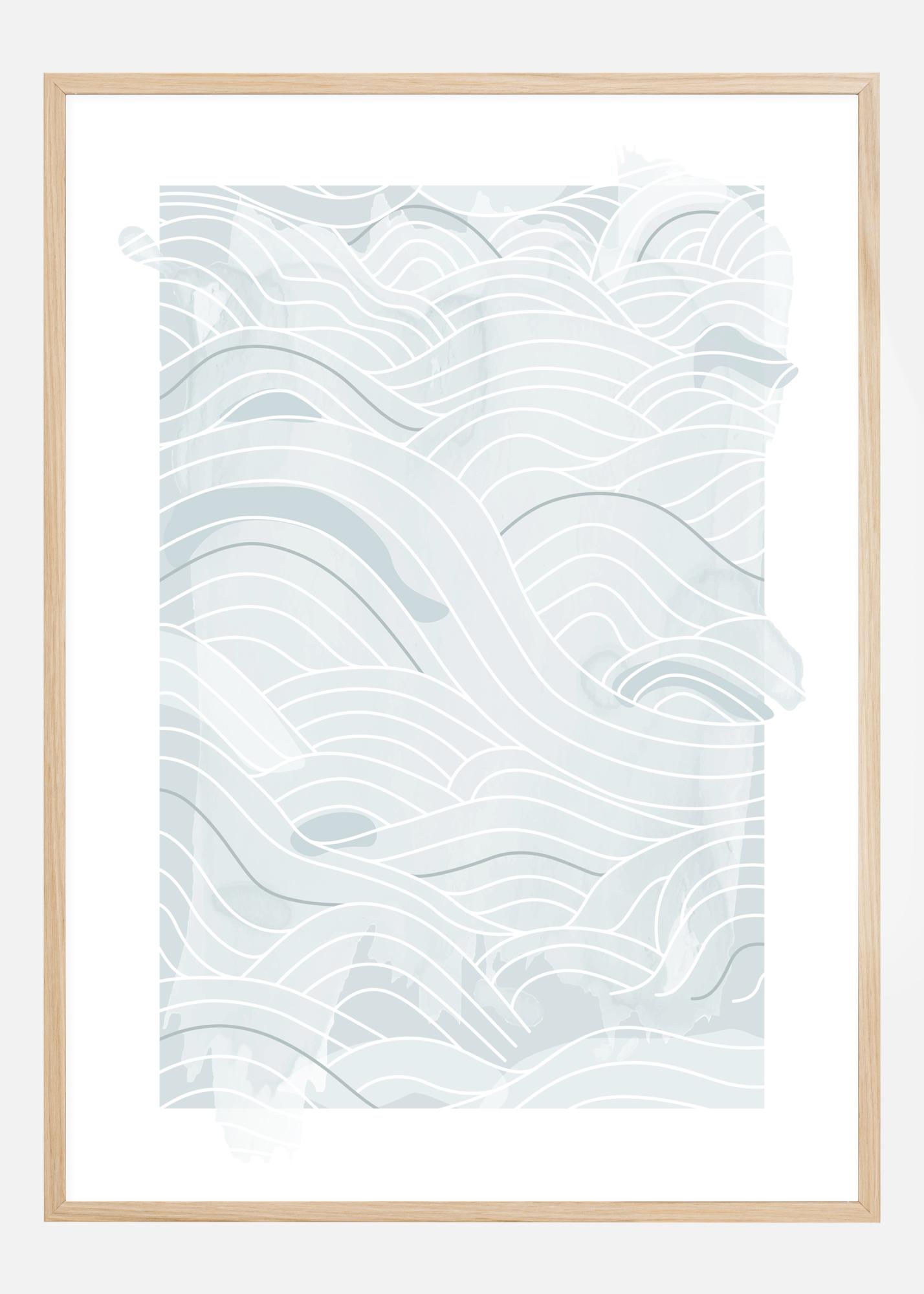Um póster marítimo com linhas abstratas e ondas azuis suaves num fundo branco. Diferentes tons de azul e espessuras de linha são combinados para criar essas ondas fluidas pela página. deixe a sua mente vagar e se deixe envolver por esse padrão marítimo suave.