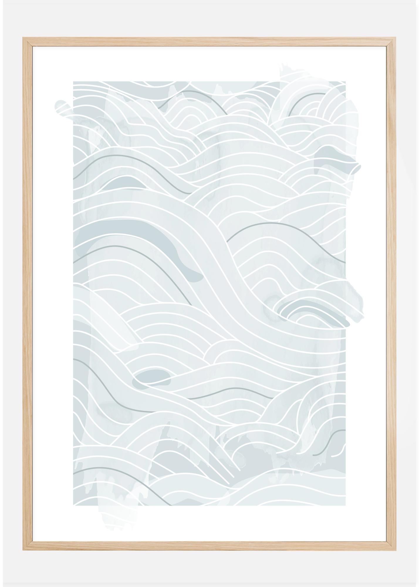 Um póster marítimo com linhas abstratas e ondas azuis suaves num fundo branco. Diferentes tons de azul e espessuras de linha são combinados para criar essas ondas fluidas pela página. deixe a sua mente vagar e se deixe envolver por esse padrão marítimo suave.