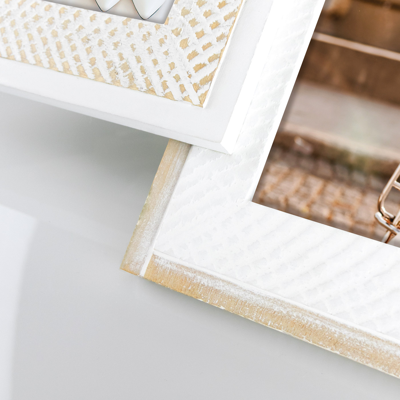 Quadro de colagem rústico em branco e madeira que emoldura elegantemente várias das suas fotos e ao mesmo tempo se torna um belo detalhe em sua casa. Este belo quadro de colagem tem espaço para 4 fotos nos tamanhos 10x10 cm / 10x15 cm / 13x18 cm. O quadro de colagem é feito de madeira e tem dimensões externas de 38,8x39,8 cm. Suporte de parede incluído.