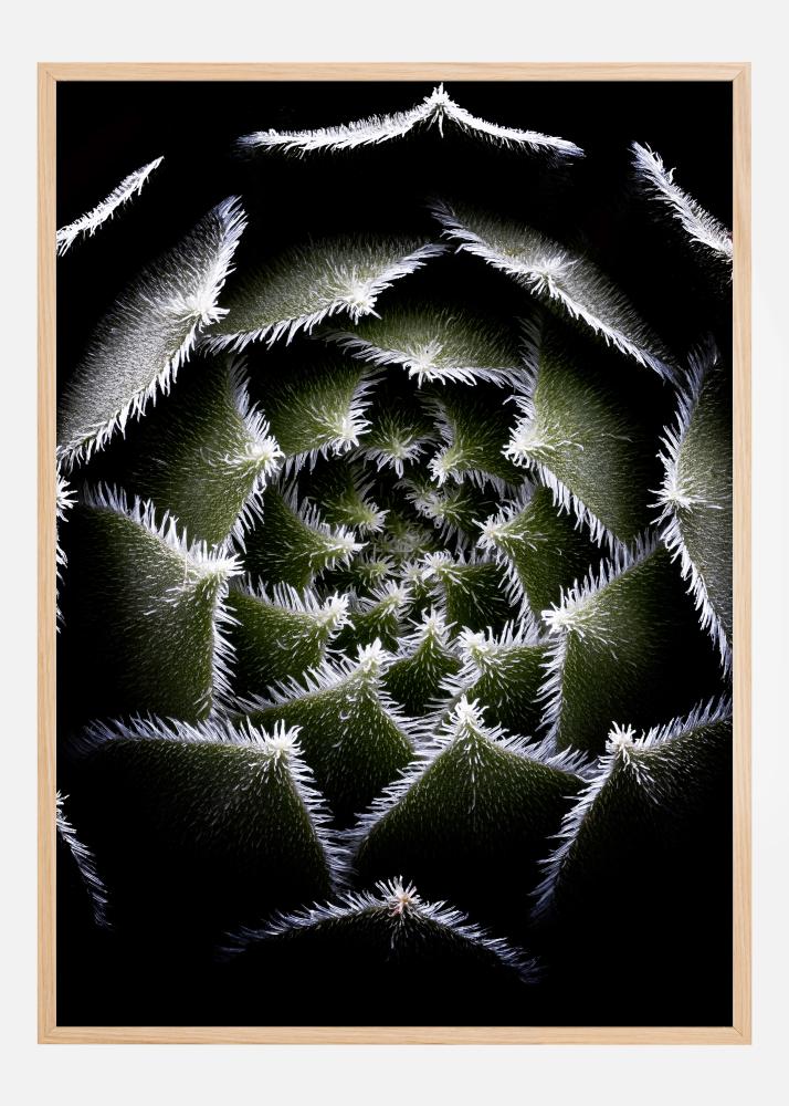 Uma foto macro de uma roseta de sempervivum. A imagem em close desta planta mostra a roseta de folhas verde-escuras, cada uma delas com pequenos espinhos brancos. Os detalhes são incríveis e todos vão parar para admirar este incrível póster.