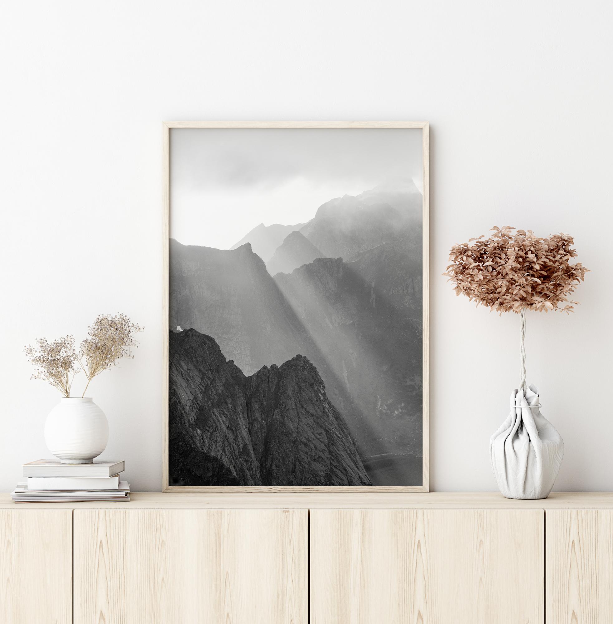 Um póster de paisagem majestosa onde um raio de sol intenso brilha entre as montanhas. As formas escuras e onduladas do lado da montanha se erguem contra o céu branco claro onde o sol brilha. Adicione esta imagem incrível à sua parede para uma cena dramática, mas ainda mágica.