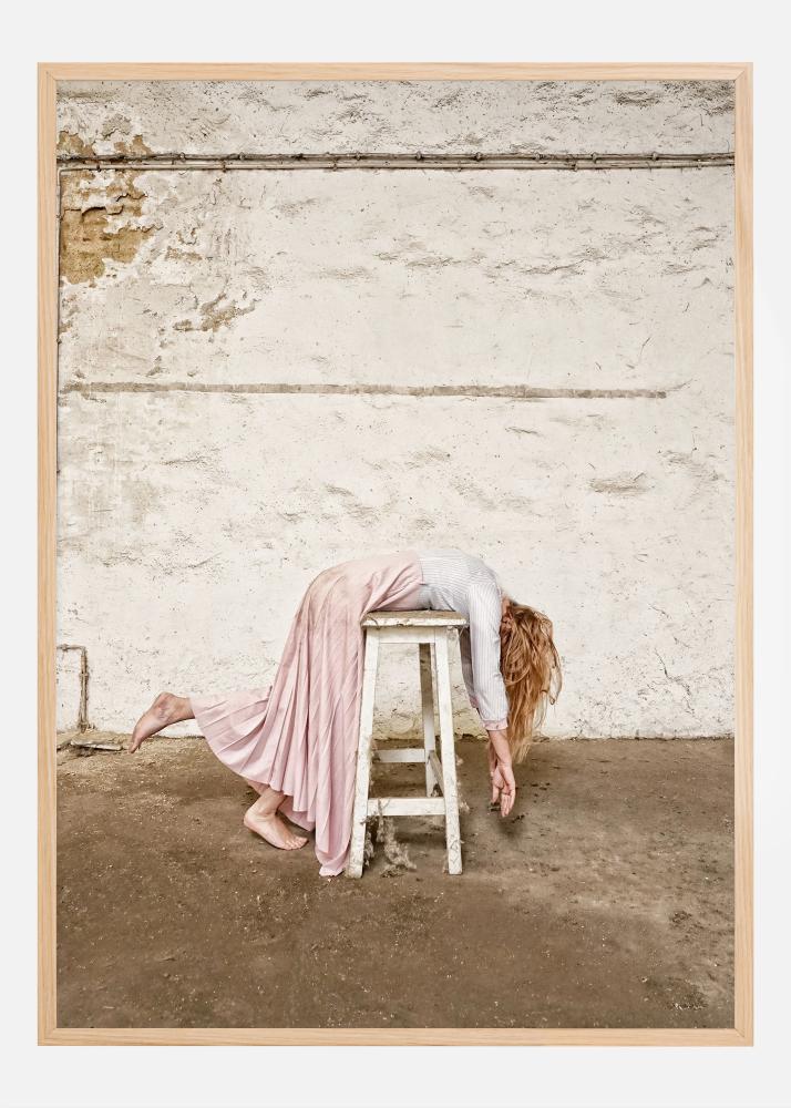 Este cartaz impressionante captura uma cena incomum e carregada de emoção. Uma pessoa está retratada em uma posição sugestiva sobre um banco branco desgastado, com a cabeça inclinada para baixo e o braço elegantemente esticado em direção ao chão de concreto nu. A vestimenta da pessoa consiste em uma saia rosa clara e uma camisa listrada, que junto com o fundo áspero de uma parede desgastada, cria um forte contraste visual. A cor rosa pálido da saia e os tons suaves de branco e azul da camisa estão em fina harmonia com os tons neutros da parede e o banco de madeira envelhecida.