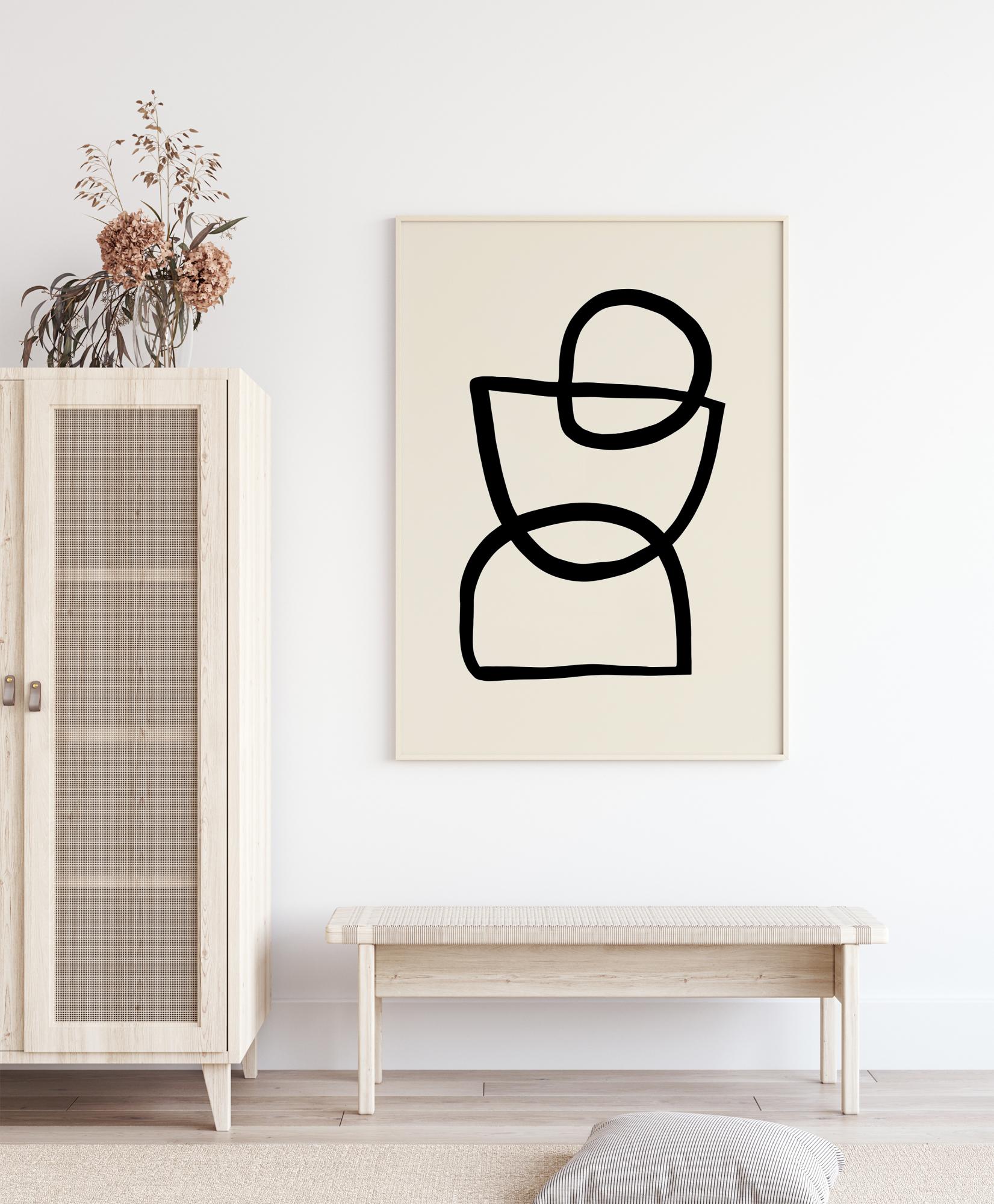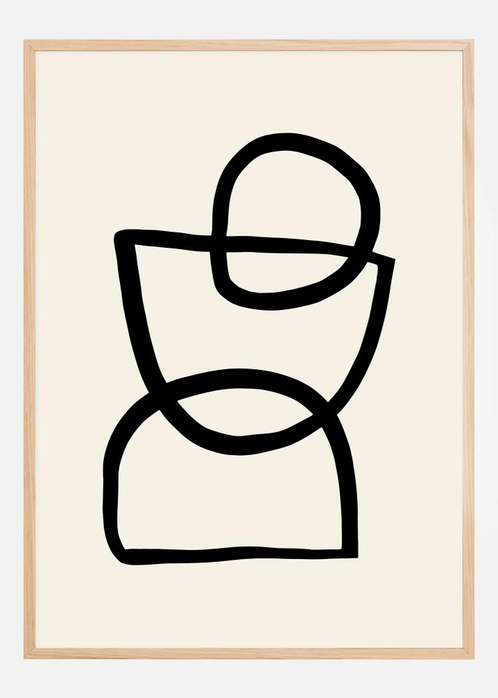 Um póster abstrato divertido com três formas diferentes, cada uma desenhada com uma linha preta grossa. Há duas meias-circunferências e um círculo completo na parte superior. Eles se sobrepõem para criar um design abstrato. Pendure isso em casa e interprete a imagem como quiser. É uma pessoa, um porta-ovos ou uma ampulheta? Isso depende de você.