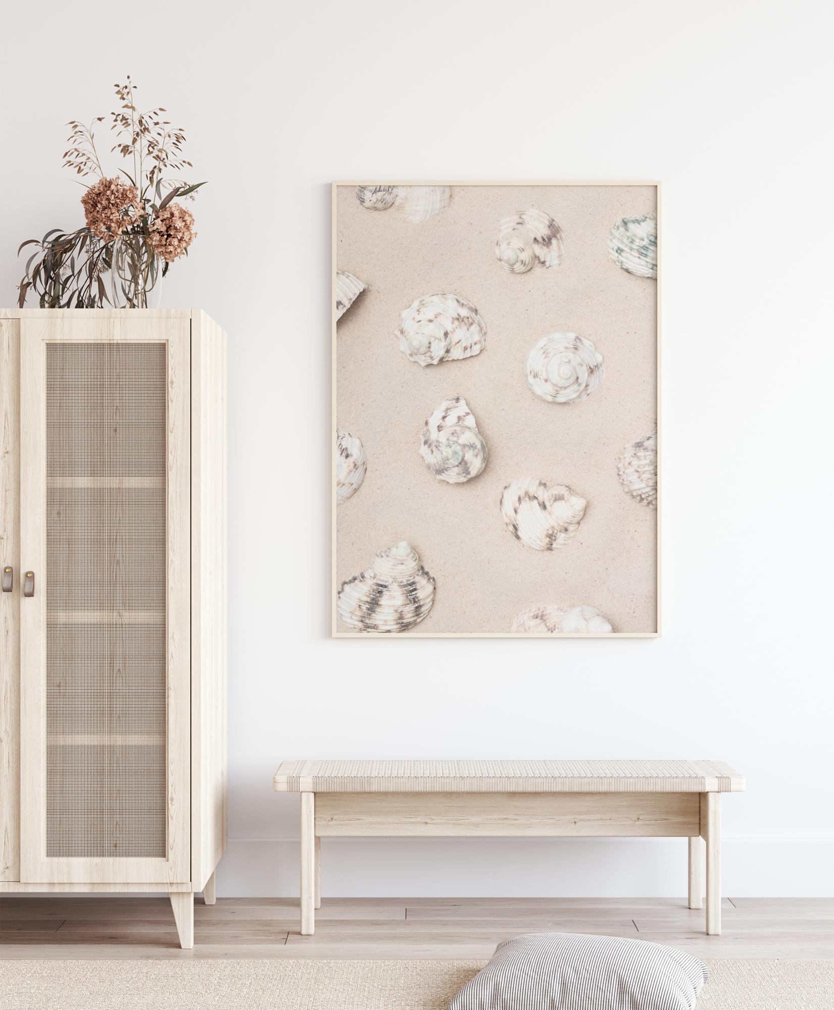 Um póster de cores pastel com conchas num fundo rosa claro. Doze conchas torcidas estão em diferentes posições, uniformemente distribuídas por toda a imagem. Cada concha é branca e marrom, o que cria uma imagem muito suave, perfeita como um padrão extra numa parede comum.