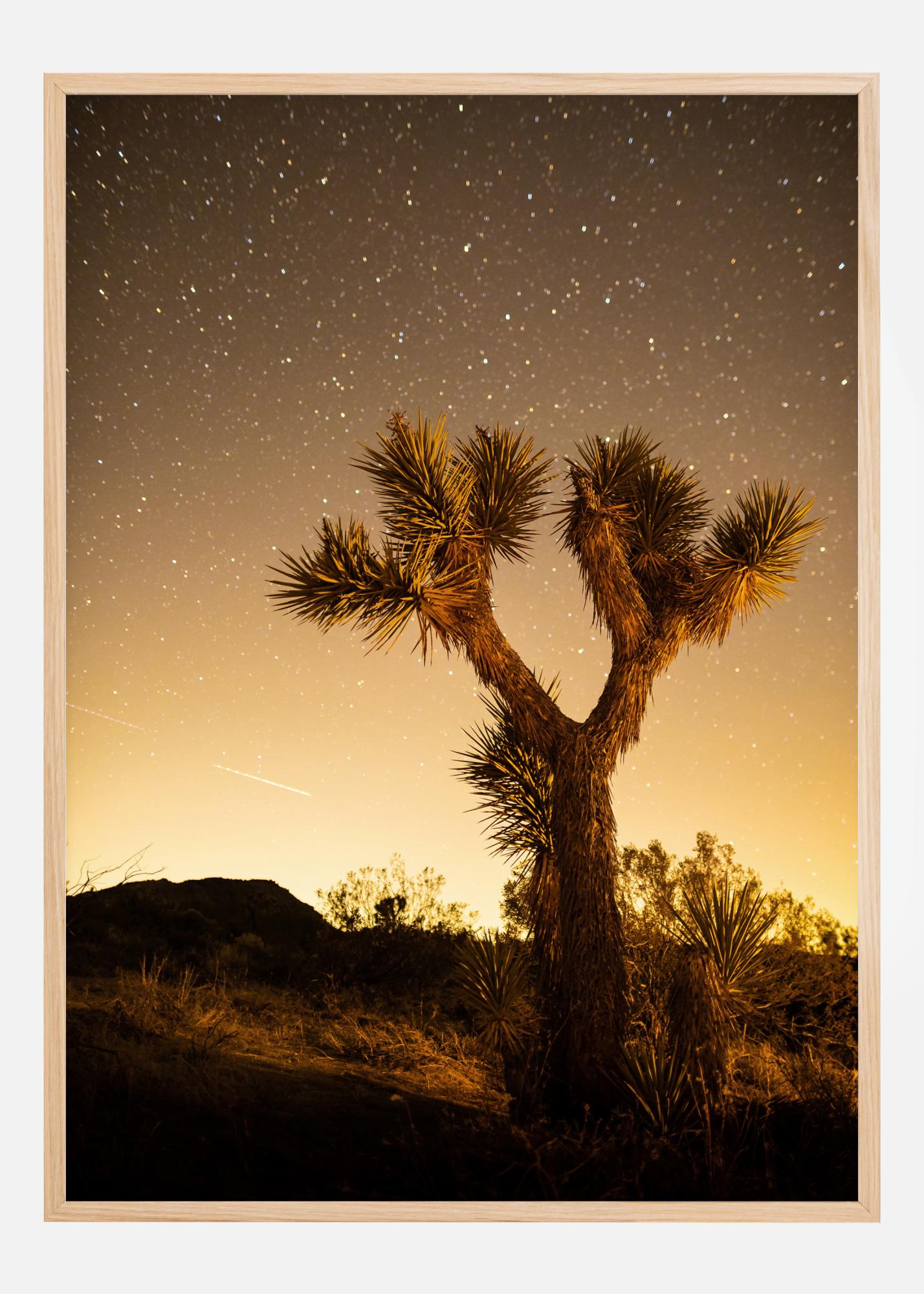 Um póster noturno com um grande cacto no deserto, que se destaca contra um céu noturno cheio de estrelas. O cacto está banhado em um brilho dourado suave enquanto o sol se põe no horizonte. As estrelas piscam suavemente pelo céu em um céu suave e quente. Aproveite o calor deste céu noturno no deserto.