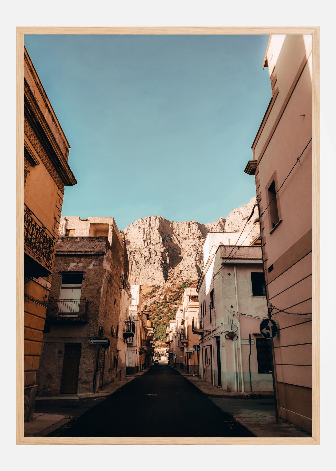 Este cartaz encantador captura a essência de uma rua pitoresca na vila siciliana de Cinisi, com suas quentes cores terrosas e um fundo da impressionante montanha que se ergue contra um céu azul-claro. Os tons rosa-pálido e amarelo dos edifícios contrastam lindamente com o terreno montanhoso em segundo plano, proporcionando uma sensação de calma e tranquilidade. Esta impressão é uma homenagem ao charme rústico da Sicília e sua capacidade de unir natureza e cultura em uma harmonia unificada.
