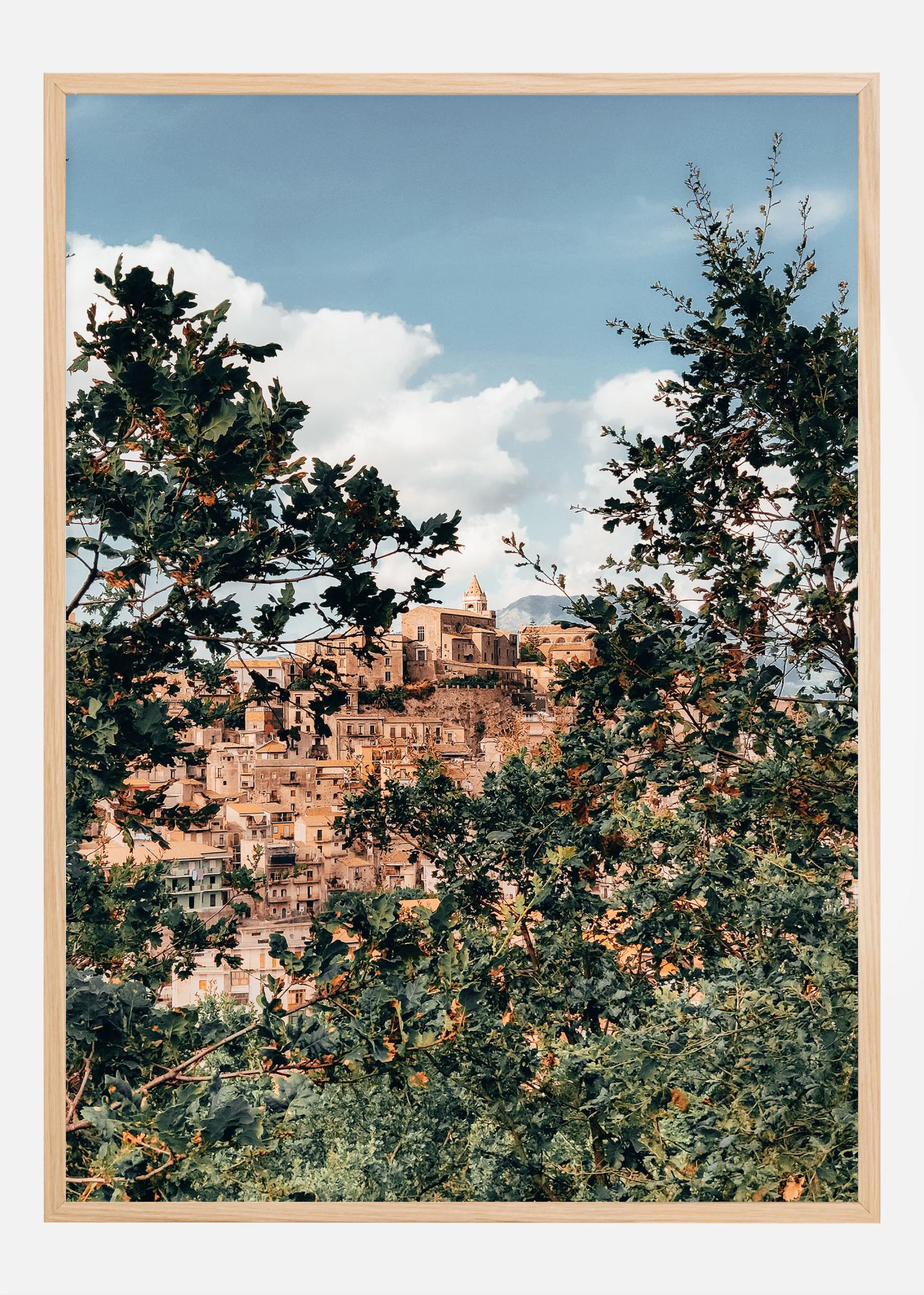 Este pôster detalhado captura a atenção com uma visão vibrante de uma cidade medieval que se eleva em direção a um céu de nuvens e azul. A cidade, situada no coração da Sicília, é rica em história e cultura, visível nos edifícios de tons quentes e nas torres de igrejas históricas. Cercado por uma folhagem exuberante, este cartaz oferece a sensação de descobrir uma joia escondida, um lugar onde cada pedra e telhado tem uma história para contar.